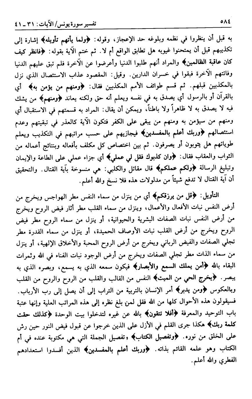 فسيقولون هذه الأحوال كلها من الله فقل لمن بلغ نظره إلى هذه المراتب العلية وإنها عتبة باب التوحيد والمعرفة أَفَلا تَتَّقُونَ بالله عن غيره لتدخلوا بيت الوحدة كَذلِكَ حَقَّتْ كَلِمَةُ رَبِّكَ هكذا جرى القلم في الأزل على الذين خرجوا عن قبول فيض النور حين رش على الخلق من نوره. وَتَفْصِيلَ الْكِتابِ وتفصيل الجملة التي هي مكتوبة عنده في أم الكتاب وهو علمه القائم بذاته. وَرَبُّكَ أَعْلَمُ بِالْمُفْسِدِينَ الذين أفسدوا استعدادهم الفطري والله أعلم.