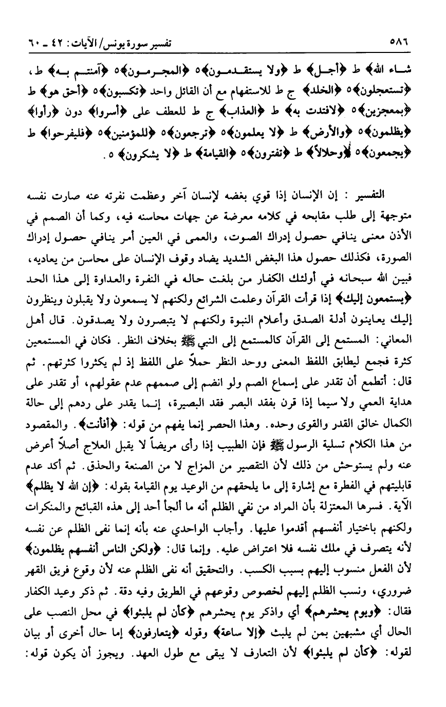 إن الإنسان إذا قوي بغضه لإنسان آخر وعظمت نفرته عنه صارت نفسه متوجهة إلى طلب مقابحه في كلامه معرضة عن جهات محاسنه فيه، وكما أن الصمم في الأذن معنى ينافي حصول إدراك الصوت، والعمى في العين أمر ينافي حصول إدراك الصورة، فكذلك حصول هذا البغض الشديد يضاد وقوف الإنسان على محاسن من يعاديه، فبين الله سبحانه في أولئك الكفار من بلغت حاله في النفرة والعداوة إلى هذا الحد يَسْتَمِعُونَ إِلَيْكَ إذا قرأت القرآن وعلمت الشرائع ولكنهم لا يسمعون ولا يقبلون وينظرون إليك يعاينون أدلة الصدق وأعلام النبوة ولكنهم لا يتبصرون ولا يصدقون. قال أهل المعاني: المستمع إلى القرآن كالمستمع إلى النبي صلّى الله عليه وسلم بخلاف النظر. فكان في المستمعين كثرة فجمع ليطابق اللفظ المعنى ووحد النظر حملا على اللفظ إذ لم يكثروا كثرتهم. ثم قال: أتطمع أن تقدر على إسماع الصم ولو انضم إلى صممهم عدم عقولهم، أو تقدر على هداية العمي ولا سيما إذا قرن بفقد البصر فقد البصيرة، إنما يقدر على ردهم إلى حالة الكمال خالق القدر والقوى وحده. وهذا الحصر إنما يفهم من قوله: أَفَأَنْتَ. والمقصود من هذا الكلام تسلية الرسول صلّى الله عليه وسلم فإن الطبيب إذا رأى مريضا لا يقبل العلاج أصلا أعرض عنه ولم يستوحش من ذلك لأن التقصير من المزاج لا من الصنعة والحذق. ثم أكد عدم قابليتهم في الفطرة مع إشارة إلى ما يلحقهم من الوعيد يوم القيامة بقوله: إِنَّ اللَّهَ لا يَظْلِمُ الآية. فسرها المعتزلة بأن المراد من نفي الظلم أنه ما ألجأ أحد إلى هذه القبائح والمنكرات ولكنهم باختيار أنفسهم أقدموا عليها. وأجاب الواحدي عنه بأنه إنما نفى الظلم عن نفسه لأنه يتصرف في ملك نفسه فلا اعتراض عليه. وإنما قال: وَلكِنَّ النَّاسَ أَنْفُسَهُمْ يَظْلِمُونَ لأن الفعل منسوب إليهم بسبب الكسب. والتحقيق أنه نفى الظلم عنه لأن وقوع فريق القهر ضروري، ونسب الظلم إليهم لخصوص وقوعهم في الطريق وفيه دقة. ثم ذكر وعيد الكفار فقال: وَيَوْمَ يَحْشُرُهُمْ أي واذكر يوم يحشرهم كَأَنْ لَمْ يَلْبَثُوا في محل النصب على الحال أي مشبهين بمن لم يلبث إِلَّا ساعَةً وقوله يَتَعارَفُونَ إما حال أخرى أو بيان لقوله: كَأَنْ لَمْ يَلْبَثُوا لأن التعارف لا يبقى مع طول العهد. ويجوز أن يكون قوله:
