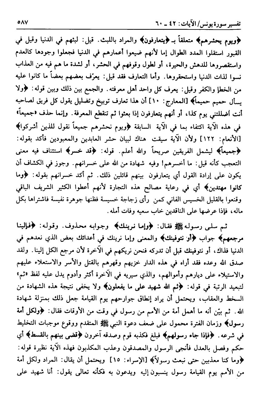وَيَوْمَ يَحْشُرُهُمْ متعلقا ب يَتَعارَفُونَ والمراد باللبث. قيل: لبثهم في الدنيا وقيل في القبور استقلوا المدد الطوال إما لأنهم ضيعوا أعمارهم في الدنيا فجعلوا وجودها كالعدم واستقصروها للدهش والحيرة، أو لطول وقوفهم في الحشر، أو لشدة ما هم فيه من العذاب نسوا لذات الدنيا واستحقروها. وأما التعارف فقد قيل: يعرّف بعضهم بعضا ما كانوا عليه من الخطإ والكفر وقيل: يعرف كل واحد أهل معرفته. والجمع بين ذلك وبين قوله: وَلا يَسْئَلُ حَمِيمٌ حَمِيماً [المعارج: 10] أن هذا تعارف توبيخ وتضليل يقول كل فريق لصاحبه أنت اضللتني يوم كذا، أو أنهم يتعارفون إذا بعثوا ثم تنقطع المعرفة. وإنما حذف «جميعا» في هذه الآية اكتفاء بما في الآية السابقة وَيَوْمَ نَحْشُرُهُمْ جَمِيعاً ثُمَّ نَقُولُ لِلَّذِينَ أَشْرَكُوا [الأنعام: 122] ولأن الآية سيقت هناك لبيان حشر العابدين والمعبودين فأكد بقوله: