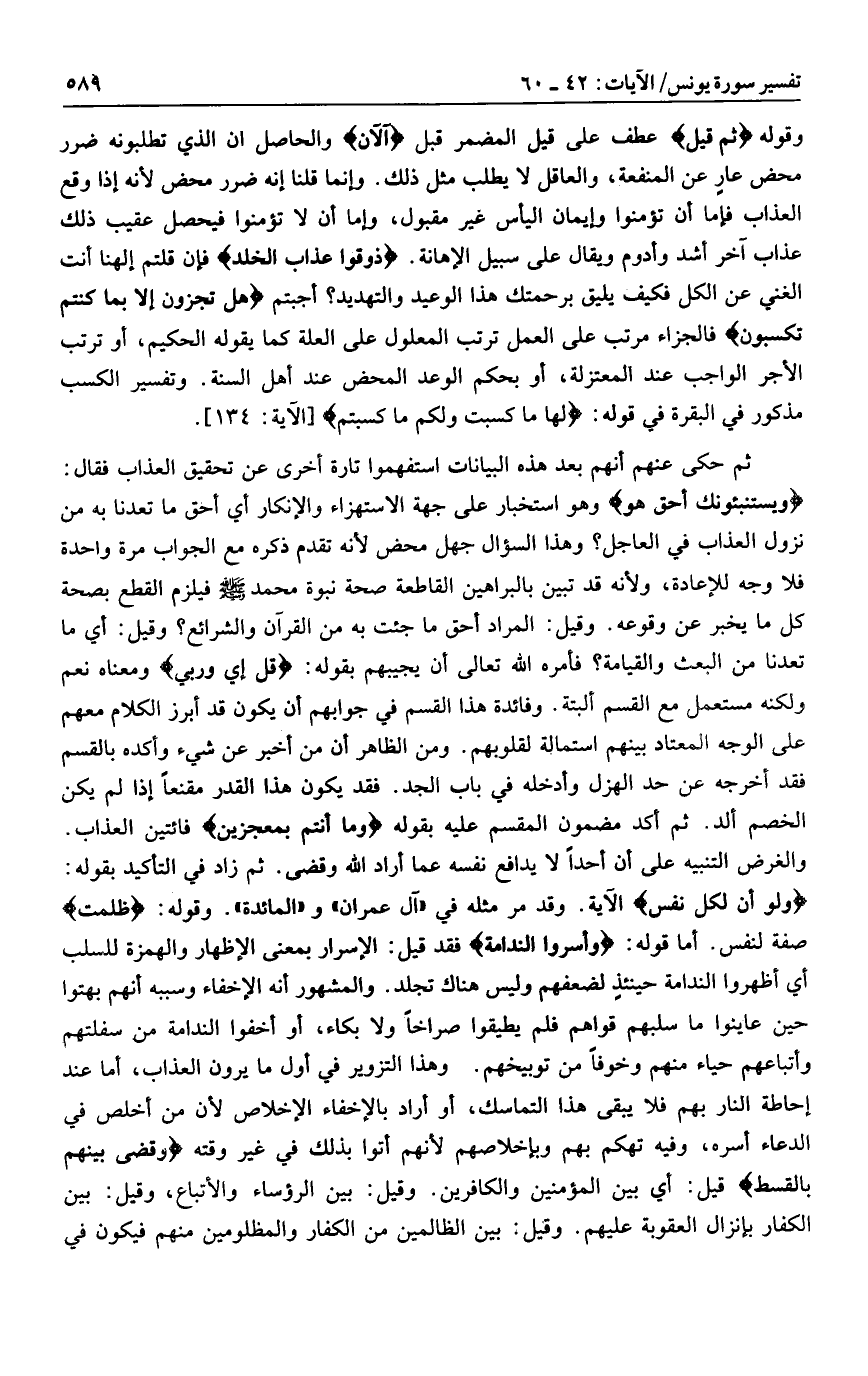 وَلَوْ أَنَّ لِكُلِّ نَفْسٍ الآية. وقد مر مثله في «آل عمران» و «المائدة» . وقوله: ظَلَمَتْ صفة لنفس. أما قوله: وَأَسَرُّوا النَّدامَةَ فقد قيل: الإسرار بمعنى الإظهار والهمزة للسلب أي أظهروا الندامة حينئذ لضعفهم وليس هناك تجلد. والمشهور أنه الإخفاء وسببه أنهم بهتوا حين عاينوا ما سلبهم قواهم فلم يطيقوا صراخا ولا بكاء، أو أخفوا الندامة من سفلتهم وأتباعهم حياء منهم وخوفا من توبيخهم. وهذا التزوير في أول ما يرون العذاب، أما عند إحاطة النار بهم فلا يبقى هذا التماسك، أو أراد بالإخفاء الإخلاص لأن من أخلص في الدعاء أسره، وفيه تهكم بهم وبإخلاصهم لأنهم أتوا بذلك في غير وقته وَقُضِيَ بَيْنَهُمْ بِالْقِسْطِ قيل: أي بين المؤمنين والكافرين. وقيل: بين الرؤساء والأتباع، وقيل: بين الكفار بإنزال العقوبة عليهم. وقيل: بين الظالمين من الكفار والمظلومين منهم فيكون في