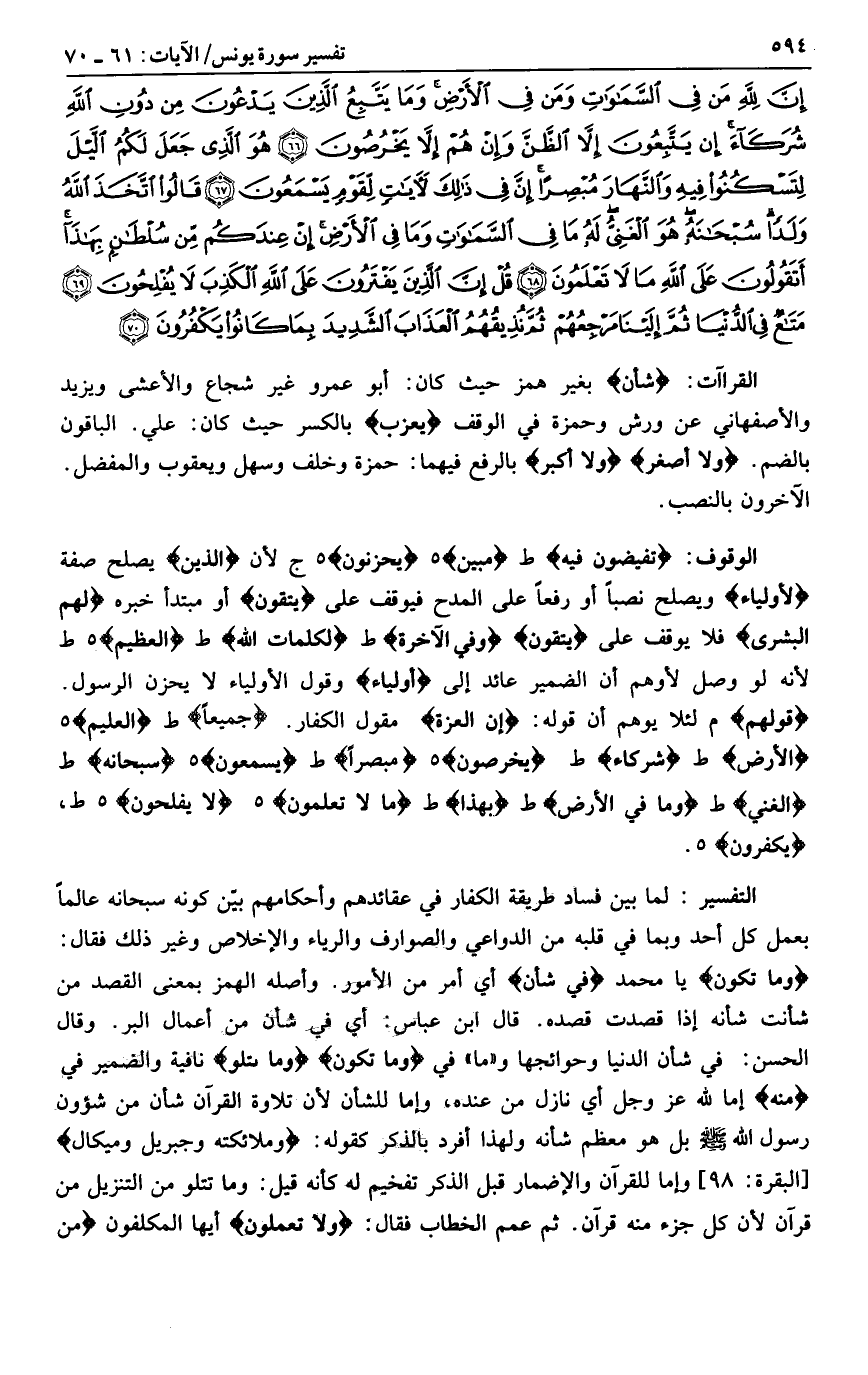 قَوْلُهُمْ م لئلا يوهم أن قوله: إِنَّ الْعِزَّةَ مقول الكفار. جَمِيعاً ط الْعَلِيمُ هـ الْأَرْضِ ط شُرَكاءَ ط يَخْرُصُونَ هـ مُبْصِراً ط يَسْمَعُونَ هـ سُبْحانَهُ ط الْغَنِيُّ ط وَما فِي الْأَرْضِ ط بِهذا ط ما لا تَعْلَمُونَ هـ لا يُفْلِحُونَ هـ ط، يَكْفُرُونَ هـ.