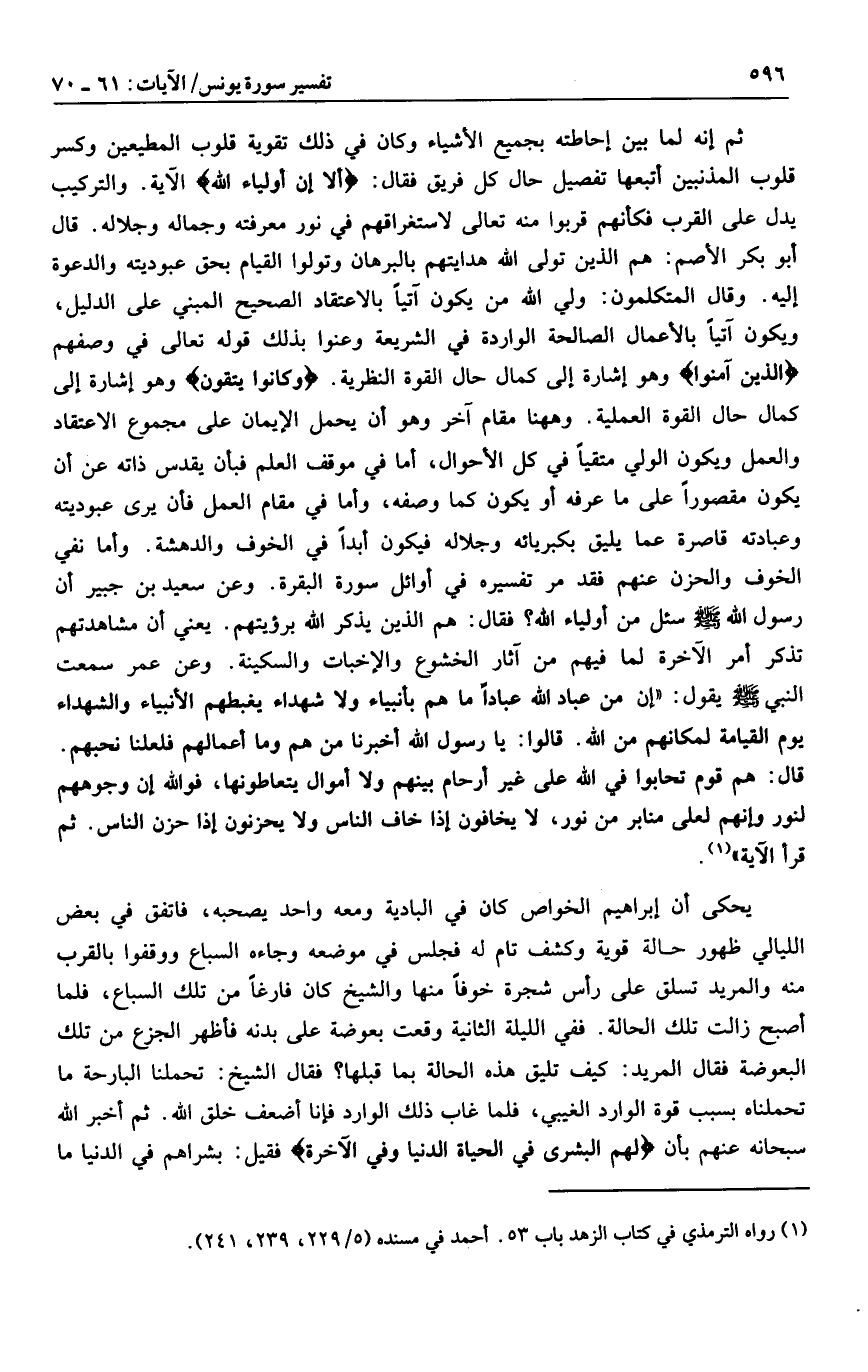 يحكى أن إبراهيم الخواص كان في البادية ومعه واحد يصحبه، فاتفق في بعض الليالي ظهور حالة قوية وكشف تام له فجلس في موضعه وجاءه السباع ووقفوا بالقرب منه والمريد تسلق على رأس شجرة خوفا منها والشيخ كان فارغا من تلك السباع، فلما أصبح زالت تلك الحالة. ففي الليلة الثانية وقعت بعوضة على بدنه فأظهر الجزع من تلك البعوضة فقال المريد: كيف تليق هذه الحالة بما قبلها؟ فقال الشيخ: تحملنا البارحة ما تحملناه بسبب قوة الوارد الغيبي، فلما غاب ذلك الوارد فإنا أضعف خلق الله. ثم أخبر الله سبحانه عنهم بأن هُمُ الْبُشْرى فِي الْحَياةِ الدُّنْيا وَفِي الْآخِرَةِ