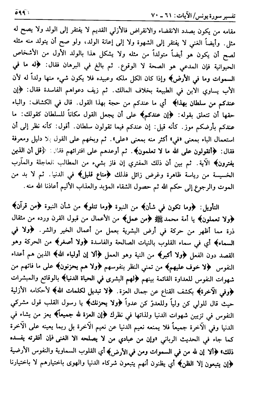 وَما تَكُونُ فِي شَأْنٍ من النبوة وَما تَتْلُوا من شأن النبوة مِنْ قُرْآنٍ وَلا تَعْمَلُونَ يا أمة محمد صلّى الله عليه وسلم مِنْ عَمَلٍ من الأعمال من قبول القرن ورده من مثقال ذرة مما أظهر من حركة في أرض البشرية بعمل من أعمال الخير والشر. وَلا فِي السَّماءِ أي في سماء القلوب بالنيات الصالحة والفاسدة وَلا أَصْغَرَ من الحركة وهو القصد دون الفعل وَلا أَكْبَرَ من النية وهو العمل أَلا إِنَّ أَوْلِياءَ اللَّهِ الذين هم أعداء النفوس لا خَوْفٌ عَلَيْهِمْ من تمني النظر بنفوسهم وَلا هُمْ يَحْزَنُونَ على ما فاتهم من شهوات النفوس للعداوة القائمة بينهم هُمُ الْبُشْرى فِي الْحَياةِ الدُّنْيا