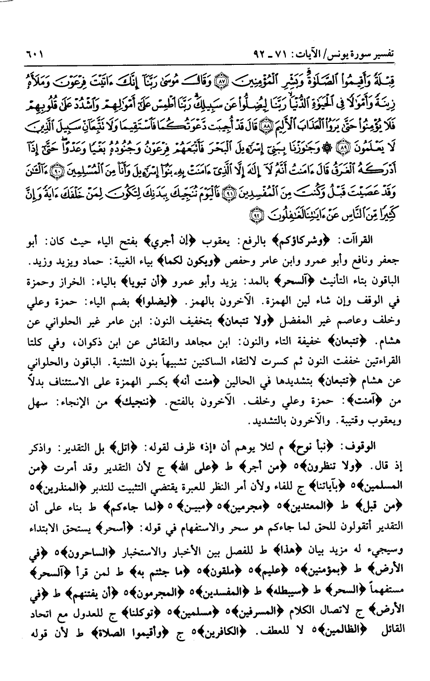 نَبَأَ نُوحٍ م لئلا يوهم أن «إذ» ظرف لقوله: اتْلُ بل التقدير: واذكر إذ قال. وَلا تُنْظِرُونِ هـ مِنْ أَجْرٍ ط عَلَى اللَّهِ ج لأن التقدير وقد أمرت مِنَ الْمُسْلِمِينَ هـ بِآياتِنا ج للفاء ولأن أمر النظر للعبرة يقتضي التثبيت للتدبر الْمُنْذَرِينَ هـ مِنْ قَبْلُ ط الْمُعْتَدِينَ هـ مُجْرِمِينَ هـ مُبِينٌ هـ لَمَّا جاءَكُمْ ط بناء على أن التقدير أتقولون للحق لما جاءكم هو سحر والاستفهام في قوله: أَسِحْرٌ يستحق الابتداء وسيجيء له مزيد بيان هذا ط للفصل بين الأخبار والاستخبار السَّاحِرُونَ هـ فِي الْأَرْضِ ط بِمُؤْمِنِينَ هـ عَلِيمٍ هـ مُلْقُونَ هـ ما جِئْتُمْ بِهِ ط لمن قرأ آلسحر مستفهما السِّحْرُ ط سَيُبْطِلُهُ ط الْمُفْسِدِينَ هـ الْمُجْرِمُونَ هـ أَنْ يَفْتِنَهُمْ ط فِي الْأَرْضِ ج لاتصال الكلام الْمُسْرِفِينَ هـ مُسْلِمِينَ هـ تَوَكَّلْنا ج للعدول مع اتحاد القائل الظَّالِمِينَ هـ لا للعطف. الْكافِرِينَ هـ ج وَأَقِيمُوا الصَّلاةَ ط لأن قوله