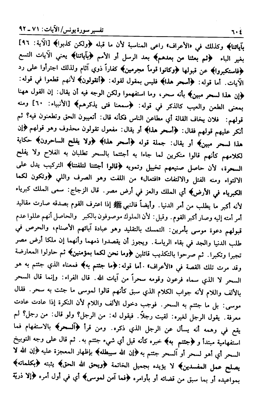 إِنَّ هذا لَسِحْرٌ مُبِينٌ بأنه سحر، وما استفهموا ولكن الوجه فيه أن يقال: إن القول هاهنا بمعنى الطعن والعيب كالذكر في قوله: سَمِعْنا فَتًى يَذْكُرُهُمْ [الأنبياء: 60] ومنه قولهم: فلان يخاف القالة أي مطاعن الناس فكأنه قال: أتعيبون الحق وتطعنون فيه؟ ثم أنكر عليهم قولهم فقال: أَسِحْرٌ هذا أو يقال: مفعول تقولون محذوف وهو قولهم إِنَّ هذا لَسِحْرٌ مُبِينٌ أو يقال: جملة قوله أَسِحْرٌ هذا وَلا يُفْلِحُ السَّاحِرُونَ حكاية لكلامهم كأنهم قالوا منكرين لما جاءا به أجئتما بالسحر تطلبان به الفلاح ولا يفلح السحرة، لأن حاصل صنيعهم تخييل وتمويه قالُوا أَجِئْتَنا لِتَلْفِتَنا التركيب يدل على الالتواء ومنه الفتل والالتفات «افتعال» من اللفت وهو الصرف واللي وَتَكُونَ لَكُمَا الْكِبْرِياءُ فِي الْأَرْضِ أي الملك والعز في أرض مصر. قال الزجاج: سمى الملك كبرياء لأنه أكبر ما يطلب من أمر الدنيا. وأيضا فالنبي صلّى الله عليه وسلم إذا اعترف القوم بصدقه صارت مقاليد أمر أمته إليه وصار أكبر القوم. وقيل: لأن الملوك موصوفون بالكبر والحاصل أنهم عللوا عدم قبولهم دعوة موسى بأمرين: التمسك بالتقليد وهو عبادة آبائهم الأصنام، والحرص في طلب الدنيا والجد في بقاء الرياسة. ويجوز أن يقصدوا ذمهما وأنهما إن ملكا أرض مصر تجبرا وتكبرا. ثم صرحوا بالتكذيب قائلين وَما نَحْنُ لَكُما بِمُؤْمِنِينَ ثم حاولوا المعارضة وقد مرت تلك القصة في «الأعراف» . أما قوله: ما جِئْتُمْ بِهِ فمعناه الذي جئتم به هو السحر لا الذي سماه فرعون وقومه سحرا من آيات الله. قال الفراء: وإنما قال السحر بالألف واللام لأنه جواب الكلام الذي سبق كأنهم قالوا لموسى ما جئت به سحر. فقال موسى: بل ما جئتم به السحر. فوجب دخول الألف واللام لأن النكرة إذا عادت عادت معرفة. يقول الرجل لغيره: لقيت رجلا. فيقول له: من الرجل؟ ولو قال: من رجل؟ لم يقع في وهمه أنه يسأل عن الرجل الذي ذكره. ومن قرأ آلسحر بالاستفهام فما استفهامية مبتدأ وجِئْتُمْ بِهِ خبره كأنه قيل أي شيء جئتم به. ثم قال على وجه التوبيخ السحر أي أهو لسحر أو آلسحر جئتم به إِنَّ اللَّهَ سَيُبْطِلُهُ بإظهار المعجزة عليه إِنَّ اللَّهَ لا يُصْلِحُ عَمَلَ الْمُفْسِدِينَ لا يؤيده بجميل الخاتمة وَيُحِقُّ اللَّهُ الْحَقَّ يثبته بِكَلِماتِهِ بمواعيده أو بما سبق من قضائه أو بأوامره فَما آمَنَ لِمُوسى أي في أول أمره إِلَّا ذُرِّيَّةٌ