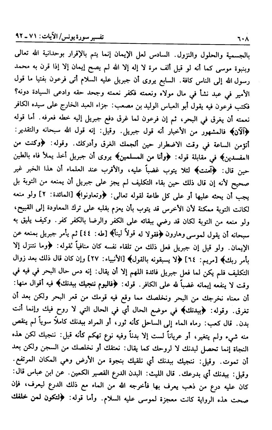 والأقرب عند العلماء أن هذا الخبر غير صحيح لأنه إن قال ذلك حين بقاء التكليف لم يجز على جبريل أن يمنعه من التوبة بل يجب أن يحثه عليها أو على كل طاعة لقوله تعالى: وَتَعاوَنُوا [المائدة: 2] ولو منعه لكانت التوبة ممكنة لأن الأخرس قد يتوب بأن يعزم بقلبه على ترك المعاودة إلى القبيح، ولو منعه من التوبة لكان قد رضي ببقائه على الكفر والرضا بالكفر كفر. وكيف يليق به سبحانه أن يقول لموسى وهارون فَقُولا لَهُ قَوْلًا لَيِّناً [طه: 44] ثم يأمر جبريل بمنعه عن الإيمان. ولو قيل إن جبريل فعل ذلك من تلقاء نفسه كان منافيا لقوله: وَما نَتَنَزَّلُ إِلَّا بِأَمْرِ رَبِّكَ [مريم: 64] لا يَسْبِقُونَهُ بِالْقَوْلِ [الأنبياء: 27] وإن كان قال ذلك بعد زوال التكليف فلم يكن لما فعل جبريل فائدة اللهم إلا أن يقال: إنه دس حال البحر في فيه في وقت لا ينفعه إيمانه غضبا لله على الكافر. قوله: فَالْيَوْمَ نُنَجِّيكَ بِبَدَنِكَ فيه أقوال منها: