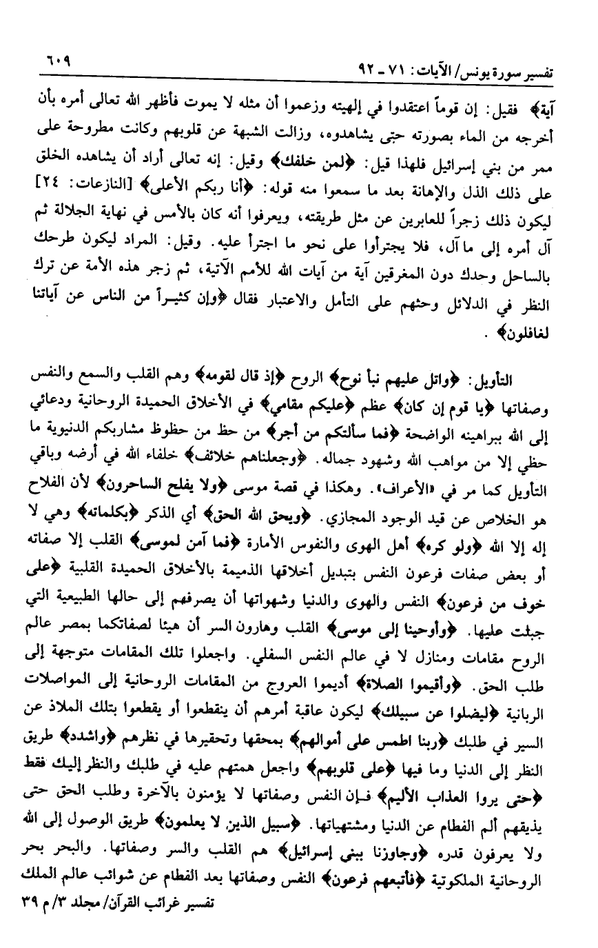 وَاتْلُ عَلَيْهِمْ نَبَأَ نُوحٍ الروح إِذْ قالَ لِقَوْمِهِ وهم القلب والسمع والنفس وصفاتها يا قَوْمِ إِنْ كانَ عظم عَلَيْكُمْ مَقامِي في الأخلاق الحميدة الروحانية ودعائي إلى الله ببراهينه الواضحة فَما سَأَلْتُكُمْ مِنْ أَجْرٍ من حظ من حظوظ مشاربكم الدنيوية ما حظي إلا من مواهب الله وشهود جماله. وَجَعَلْناهُمْ خَلائِفَ خلفاء الله في أرضه وباقي التأويل كما مر في «الأعراف» . وهكذا في قصة موسى وَلا يُفْلِحُ السَّاحِرُونَ لأن الفلاح هو الخلاص عن قيد الوجود المجازي. وَيُحِقُّ اللَّهُ الْحَقَّ أي الذكر بِكَلِماتِهِ وهي لا إله إلا الله وَلَوْ كَرِهَ أهل الهوى والنفوس الأمارة فَما آمَنَ لِمُوسى القلب إلا صفاته أو بعض صفات فرعون النفس بتبديل أخلاقها الذميمة بالأخلاق الحميدة القلبية عَلى خَوْفٍ مِنْ فِرْعَوْنَ النفس والهوى والدنيا وشهواتها أن يصرفهم إلى حالها الطبيعية التي جبلت عليها. وَأَوْحَيْنا إِلى مُوسى القلب وهارون السر أن هيئا لصفاتكما بمصر عالم الروح مقامات ومنازل لا في عالم النفس السفلي. واجعلوا تلك المقامات متوجهة إلى طلب الحق. وَأَقِيمُوا الصَّلاةَ أديموا العروج من المقامات الروحانية إلى المواصلات الربانية لِيُضِلُّوا عَنْ سَبِيلِكَ ليكون عاقبة أمرهم أن ينقطعوا أو يقطعوا بتلك الملاذ عن السير في طلبك رَبَّنَا اطْمِسْ عَلى أَمْوالِهِمْ بمحقها وتحقيرها في نظرهم وَاشْدُدْ طريق النظر إلى الدنيا وما فيها عَلى قُلُوبِهِمْ واجعل همتهم عليه في طلبك والنظر إليك فقط حَتَّى يَرَوُا الْعَذابَ الْأَلِيمَ فإن النفس وصفاتها لا يؤمنون بالآخرة وطلب الحق حتى يذيقهم ألم الفطام عن الدنيا ومشتهياتها. سَبِيلَ الَّذِينَ لا يَعْلَمُونَ طريق الوصول إلى الله ولا يعرفون قدره وَجاوَزْنا بِبَنِي إِسْرائِيلَ هم القلب والسر وصفاتها. والبحر بحر الروحانية الملكوتية فَأَتْبَعَهُمْ فِرْعَوْنُ النفس وصفاتها بعد الفطام عن شوائب عالم الملك