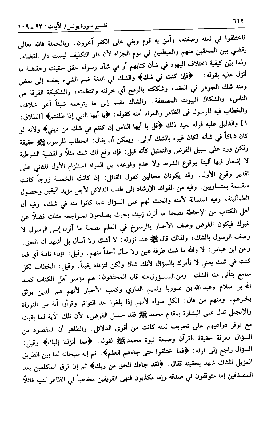 1] والدليل عليه قوله بعيد ذلك قُلْ يا أَيُّهَا النَّاسُ إِنْ كُنْتُمْ فِي شَكٍّ مِنْ دِينِي ولأنه لو كان شاكا في شأنه لكان غيره بالشك أولى. ويمكن أن يقال: الخطاب للرسول صلّى الله عليه وسلم حقيقة ولكن ورد على سبيل الفرض والتمثيل كأنه قيل: فإن وقع لك شك مثلا والقضية الشرطية لا إشعار فيها البتة بوقوع الشرط ولا عدم وقوعه، بل المراد استلزام الأول للثاني على تقدير وقوع الأول. وقد يكونان محالين كقول القائل: إن كانت الخمسة زوجا كانت منقسمة بمتساويين. وفيه من الفوائد الإرشاد إلى طلب الدلائل لأجل مزيد اليقين وحصول الطمأنينة، وفيه استمالة لأمته والحث لهم على السؤال عما كانوا منه في شك، وفيه أن أهل الكتاب من الإحاطة بصحة ما أنزل إليك بحيث يصلحون لمراجعه مثلك فضلا عن غيرك فيكون الغرض وصف الأحبار بالرسوخ في العلم بصحة ما أنزل إلى الرسول لا وصف الرسول بالشك، ولذلك
