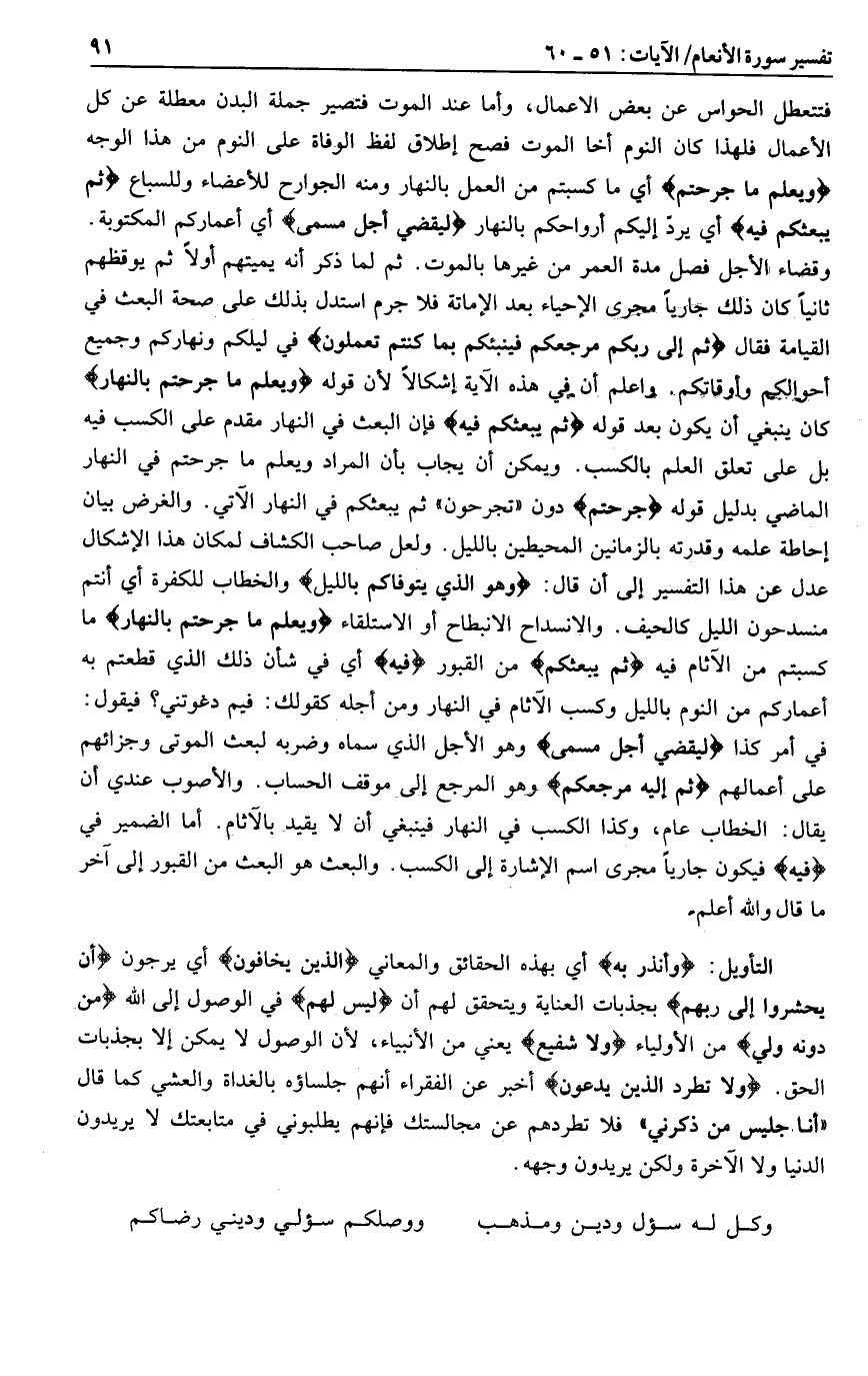 وَأَنْذِرْ بِهِ أي بهذه الحقائق والمعاني الَّذِينَ يَخافُونَ أي يرجون أَنْ يُحْشَرُوا إِلى رَبِّهِمْ بجذبات العناية ويتحقق لهم أن لَيْسَ لَهُمْ في الوصول إلى الله مِنْ دُونِهِ وَلِيٌّ من الأولياء وَلا شَفِيعٌ يعني من الأنبياء، لأن الوصول لا يمكن إلا بجذبات الحق. وَلا تَطْرُدِ الَّذِينَ يَدْعُونَ أخبر عن الفقراء أنهم جلساؤه بالغداة والعشي كما