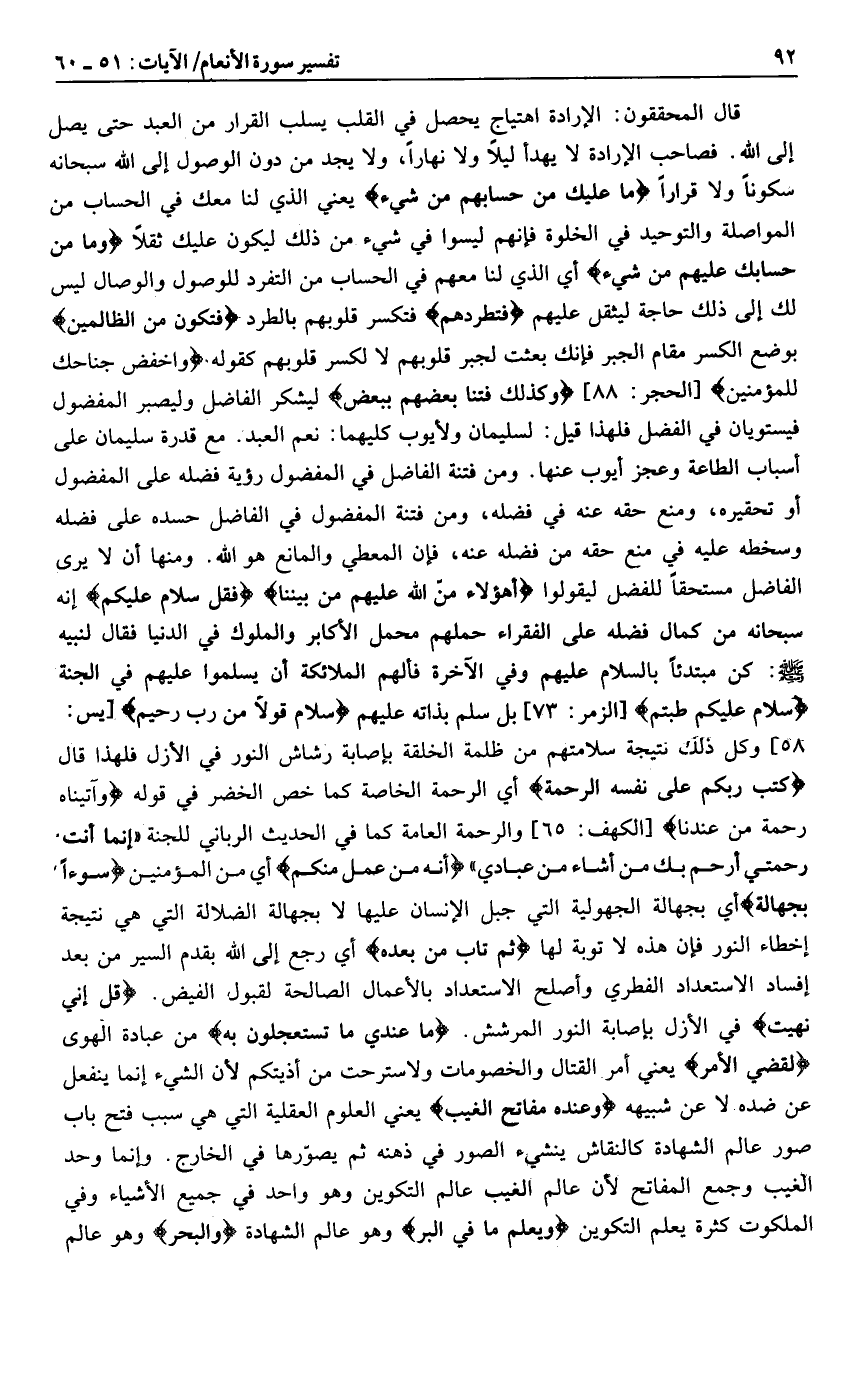 قال المحققون: الإرادة اهتياج يحصل في القلب يسلب القرار من العبد حتى يصل إلى الله. فصاحب الإرادة لا يهدأ ليلا ولا نهارا، ولا يجد من دون الوصول إلى الله سبحانه سكونا ولا قرارا ما عَلَيْكَ مِنْ حِسابِهِمْ مِنْ شَيْءٍ يعني الذي لنا معك في الحساب من المواصلة والتوحيد في الخلوة فإنهم ليسوا في شيء من ذلك ليكون عليك ثقلا وَما مِنْ حِسابِكَ عَلَيْهِمْ مِنْ شَيْءٍ أي الذي لنا معهم في الحساب من التفرد للوصول والوصال ليس لك إلى ذلك حاجة ليثقل عليهم فَتَطْرُدَهُمْ فتكسر قلوبهم بالطرد فَتَكُونَ مِنَ الظَّالِمِينَ بوضع الكسر مقام الجبر فإنك بعثت لجبر قلوبهم لا لكسر قلوبهم كقوله وَاخْفِضْ جَناحَكَ لِلْمُؤْمِنِينَ [الحجر: 88] وَكَذلِكَ فَتَنَّا بَعْضَهُمْ بِبَعْضٍ ليشكر الفاضل وليصبر المفضول فيستويان في الفضل فلهذا قيل: لسليمان ولأيوب كليهما: نعم العبد. مع قدرة سليمان على أسباب الطاعة وعجز أيوب عنها. ومن فتنة الفاضل في المفضول رؤية فضله على المفضول أو تحقيره، ومنع حقه عنه في فضله، ومن فتنة المفضول في الفاضل حسده على فضله وسخطه عليه في منع حقه من فضله عنه، فإن المعطي والمانع هو الله. ومنها أن لا يرى الفاضل مستحقا للفضل ليقولوا أَهؤُلاءِ مَنَّ اللَّهُ عَلَيْهِمْ مِنْ بَيْنِنا فَقُلْ سَلامٌ عَلَيْكُمْ إنه سبحانه من كمال فضله على الفقراء حملهم محمل الأكابر والملوك في الدنيا فقال لنبيه صلى الله عليه وسلم: كن مبتدئا بالسلام عليهم وفي الآخرة فألهم الملائكة أن يسلموا عليهم في الجنة سَلامٌ عَلَيْكُمْ طِبْتُمْ [الزمر: 73] بل سلم بذاته عليهم سَلامٌ قَوْلًا مِنْ رَبٍّ رَحِيمٍ [يس: