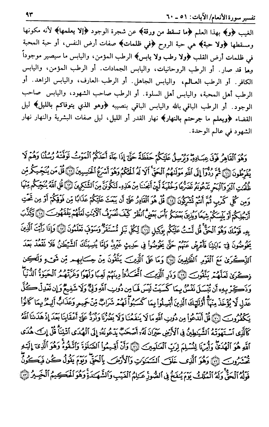الغيب وَبهذا العلم ما تَسْقُطُ مِنْ وَرَقَةٍ عن شجرة الوجود إِلَّا يَعْلَمُها لأنه مكونها ومسقطها وَلا حَبَّةٍ هي حبة الروح فِي ظُلُماتِ صفات أرض النفس، أو حبة المحبة في ظلمات أرض القلب وَلا رَطْبٍ وَلا يابِسٍ الرطب المؤمن، واليابس ما سيصير موجودا وما قد صار. أو الرطب الروحانيات، واليابس الجمادات. أو الرطب المؤمن، واليابس الكافر. أو الرطب العالم، واليابس الجاهل. أو الرطب العارف، واليابس الزاهد. أو الرطب أهل المحبة، واليابس أهل السلوة. أو الرطب صاحب الشهود، واليابس صاحب الوجود. أو الرطب الباقي بالله واليابس الباقي بنصيبه وَهُوَ الَّذِي يَتَوَفَّاكُمْ بِاللَّيْلِ ليل القضاء وَيَعْلَمُ ما جَرَحْتُمْ بِالنَّهارِ نهار القدر أو الليل، ليل صفات البشرية والنهار نهار الشهود في عالم الوحدة.