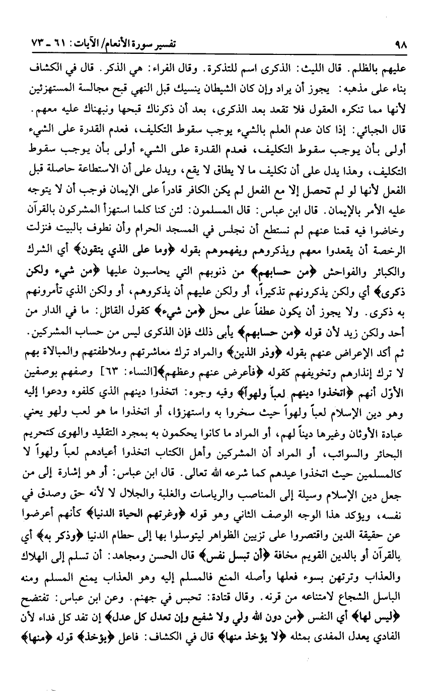 ثم أكد الإعراض عنهم بقوله وَذَرِ الَّذِينَ والمراد ترك معاشرتهم وملاطفتهم والمبالاة بهم لا ترك إنذارهم وتخويفهم كقوله فَأَعْرِضْ عَنْهُمْ وَعِظْهُمْ [النساء: 63] وصفهم بوصفين الأوّل أنهم اتَّخَذُوا دِينَهُمْ لَعِباً وَلَهْواً وفيه وجوه: اتخذوا دينهم الذي كلفوه ودعوا إليه وهو دين الإسلام لعبا ولهوا حيث سخروا به واستهزؤا، أو اتخذوا ما هو لعب ولهو يعني عبادة الأوثان وغيرها دينا لهم، أو المراد ما كانوا يحكمون به بمجرد التقليد والهوى كتحريم البحائر والسوائب، أو المراد أن المشركين وأهل الكتاب اتخذوا أعيادهم لعبا ولهوا لا كالمسلمين حيث اتخذوا عيدهم كما شرعه الله تعالى. قال ابن عباس: أو هو إشارة إلى من جعل دين الإسلام وسيلة إلى المناصب والرياسات والغلبة والجلال لا لأنه حق وصدق في نفسه، ويؤكد هذا الوجه الوصف الثاني وهو قوله وَغَرَّتْهُمُ الْحَياةُ الدُّنْيا كأنهم أعرضوا عن حقيقة الدين واقتصروا على تزيين الظواهر ليتوسلوا بها إلى حطام الدنيا وَذَكِّرْ بِهِ أي بالقرآن أو بالدين القويم مخافة أَنْ تُبْسَلَ نَفْسٌ قال الحسن ومجاهد: أن تسلم إلى الهلاك والعذاب وترتهن بسوء فعلها وأصله المنع فالمسلم إليه وهو العذاب يمنع المسلم ومنه الباسل الشجاع لامتناعه من قرنه. وقال قتادة: تحبس في جهنم. وعن ابن عباس: تفتضح لَيْسَ لَها أي النفس مِنْ دُونِ اللَّهِ وَلِيٌّ وَلا شَفِيعٌ وَإِنْ تَعْدِلْ كُلَّ عَدْلٍ إن تفد كل فداء لأن الفادي يعدل المفدى بمثله لا يُؤْخَذْ مِنْها قال في الكشاف: فاعل يُؤْخَذْ قوله مِنْها