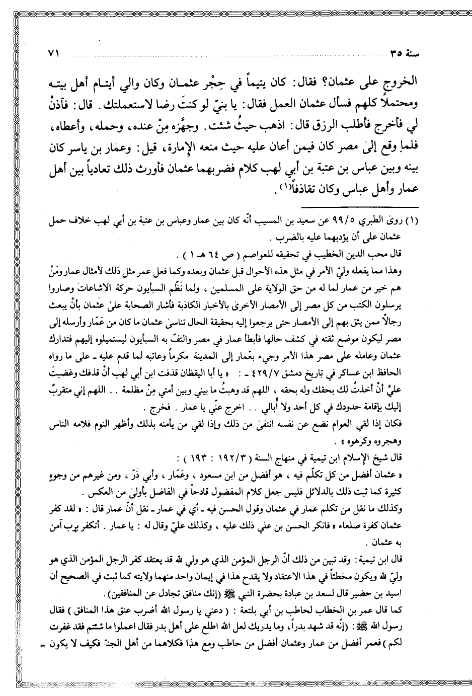 الخروخ علي عثمان فقال كان يتيما في حجر عثمان وكان والي أيتام أهل بيته ومحتملا كلهم فسأل عثمان العمل فقال يا بني لو كنت رضا لاستعملتك قال فاذن لي فأخرج فأطلب الرزق قال اذهب حيث شئت وجهزه من عنده وحمله وأعطاه فلما وقع إلي مصر كان فيمن أعان عليه حيث منعه الإمارة قيل وعمار بن ياسر كان بينه وبين عباس بن عتبة بن أبي لهب كلام فضربهما عثمان فأورث ذلك تعاديا بين أهل عمار وأهل عباس وكان تقاذفا