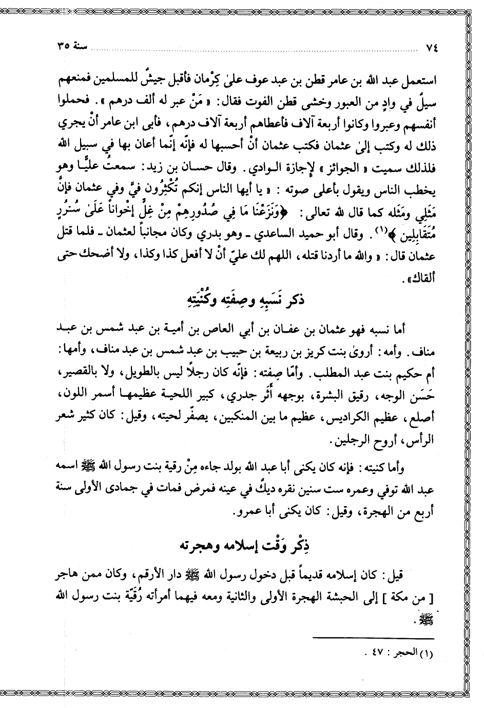 أما نسبه فهو عثمان بن عفان بن أبي العاص بن أمية بن عبد شمس بن عبد مناف وأمه أروي بنت كريز بن ربيعة بن حبيب بن عبد شمس بن عبد مناف وأمها أم حكيم بنت عبد المطلب وأما صفته فإنه كان رجلا ليس بالطويل ولا بالقصير حسن الوجه رقيق البشرة بوجهه أثر جدري كبير اللحية عظيمها أسمر اللون أصلع عظيم الكراديس عظيم ما بين المنكبين يصفر لحيته وقيل كان كثير شعر الرأس أروح الرجلين