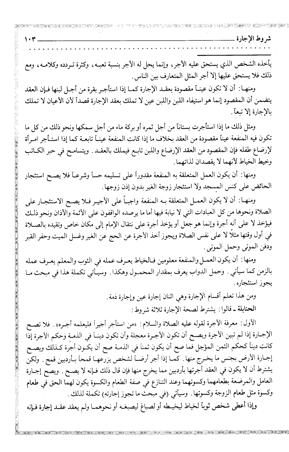 ومنها: أن يكون العمل والمنفعة معلومين فالخياط يعرف في الثوب والمعلم يعرف عمله بالزمن كما سيأتي. وحمل الدواب يعرف بمقدار المحمول وهكذا. وسيأتي تكملة هذا في مبحث ما يجوز اسئجاره.