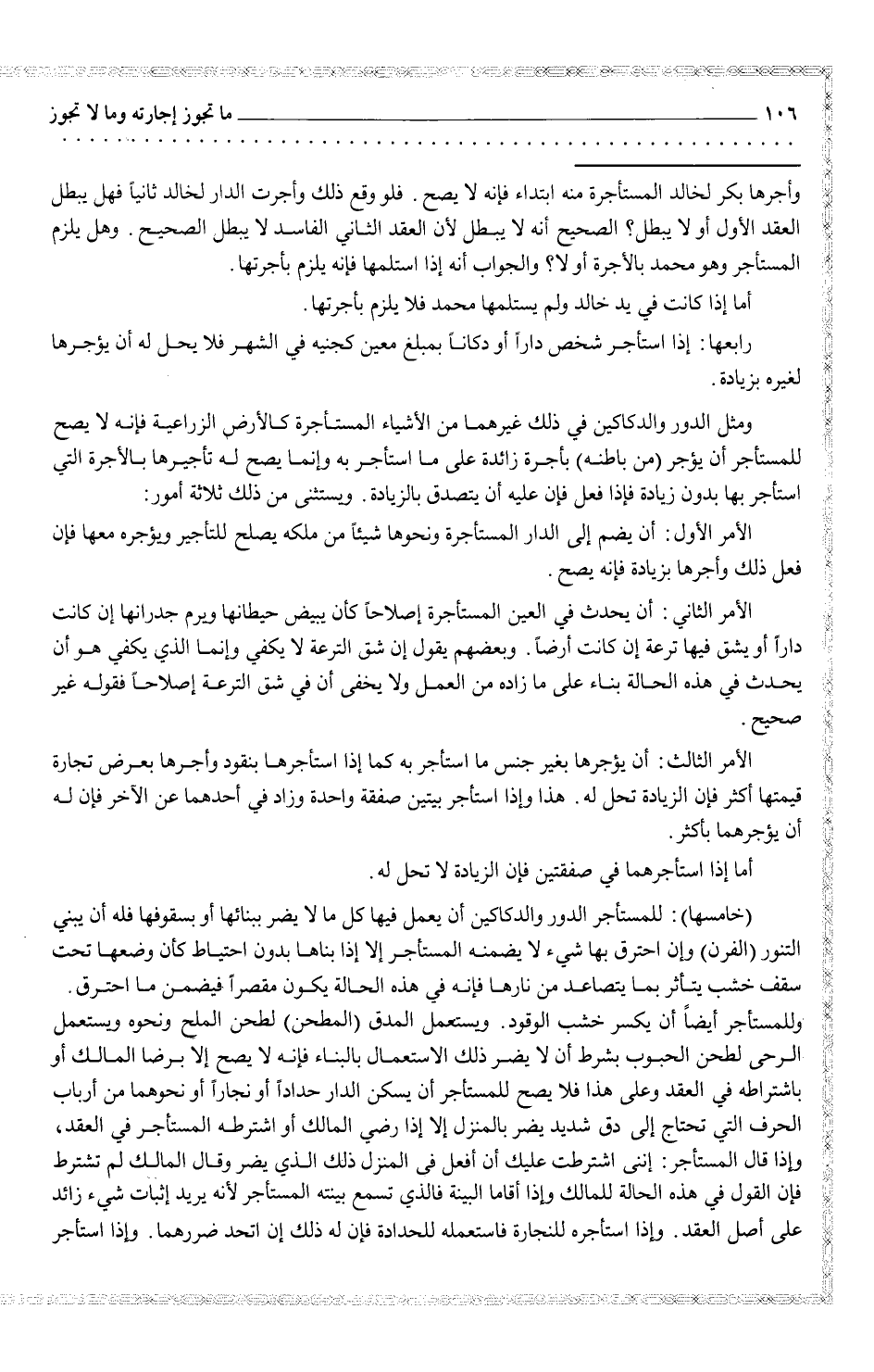(خامسها) : للمستأجر الدور والدكاكين أن يعمل فيها كل مالا يضر ببنائها أو بسقوفها فله أن يبني التنور (الفرن) وإن احترق بها شيء لا يضمنه المستأجر إلا إذا بناها بدون احتياط كأن وضعها تحت سقف خشب يتأثر بما يتصاعد من نارها فإنه في هذه الحالة يكون مقصراً فيضمن ما احترق. وللمستأجر أيضاً أن يكسر خشب الوقود. ويستعمل المدق (المطحن) لطحن الملح ونحوه ويستعمل الرحى لطحن الحبوب بشرط أن لا يضر ذلك الاستعمال بالبناء فإنه لا يصح إلا برضا المالك أو باشتراطه في العقد وعلى هذا فلا يصح للمستأجر أن يسكن الدار حداداً أو نجاراً أو نحوهما من أرباب الحرف التي تحتاج إلى دق شديد يضر بالمنزل إلا إذا رضي المالك أو اشترطه المستأجر في العقد، وإذا قال المستأجر: إنني اشترطت عليك أن أفعل في المنزل ذلك الذي يضر وقال المالك لم تشترط فإن القول في هذه الحالة للمالك وإذا أقاما البينة فالذي تسمع بينته المستأجر لأنه يريد إثبات شيء زائد على أصل العقد. وإذا استأجره للنجارة فاستعمله للحدادة فإن له إن اتحد ضررهما.