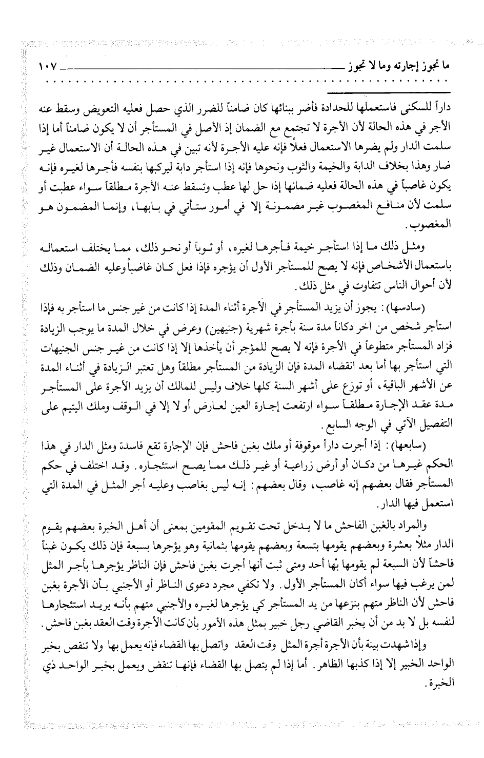 داراً للسكنى فاستعملها للحدادة فأضر ببنائها كان ضامناً للضرر الذي حصل فعليه التعويض وسقط عنه الأجر في هذه الحالة لأن الأجرة لا تجتمع مع الضمان إذ الأصل في المستأجر أن لا يكون ضامناً أما إذا سلمت الدار ولم يضرها الاستعمال فإنه عليه الأجرة لأنه تبين في هذه الحالة أن الاستعمال غير ضار وهذا بخلاف الدابة والخيمة فعلاً والثوب ونحوها فإنه إذا استأجر دابة ليرطبها فأجرها لغيره فإنه يكون غاصباً في هذه الحالة فعليه ضمانها إذا حل لها عطب وتسقط عنه الأجرة مطلقاً سواء عطبت أو سلمت لأن منافع المغصوب غير مضمونة إلا في أمور ستأتي في بابها، وإنما المضمون هو المغصوب.