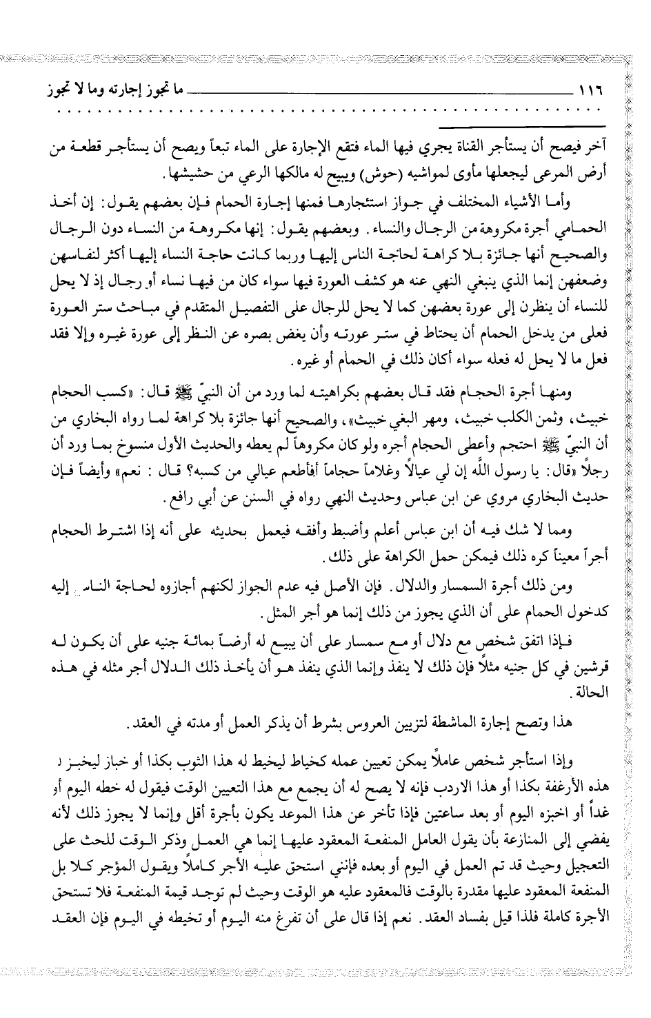 وأما الأشياء المختلف في جواز استئجارها فمنها إجارة الحمام فإن بعضهم يقول: إن أخذ الحمامي أجرة مكروهة من الرجال والنساء. وبعضهم يقول: إنها مكروهة من النساء دون الرجال والصحيح أنها جائزة بلا كراهة لحاجة الناس إليها وربما كانت حاجة النساء إليها أكثر من لنفاسهن وضعفهن إنما الذي ينبغي النهي عنه هو كشف العورة فيها سواء كان من فيها نساء أم رجال إذ لا يحل للنساء أن ينظرن إلى عورة بعضهن كما لا يحل للرجال على التفصيل المتقدم في مباحث ستر العورة فعلى من يدخل الحمام أن يحتاط في ستر عورته وأن يغض بصره عن النظر إلى عورة غيره وإلا فقد فعل ما لا يحل له فعله سواء أكان ذلك في الحمام أو غيره.