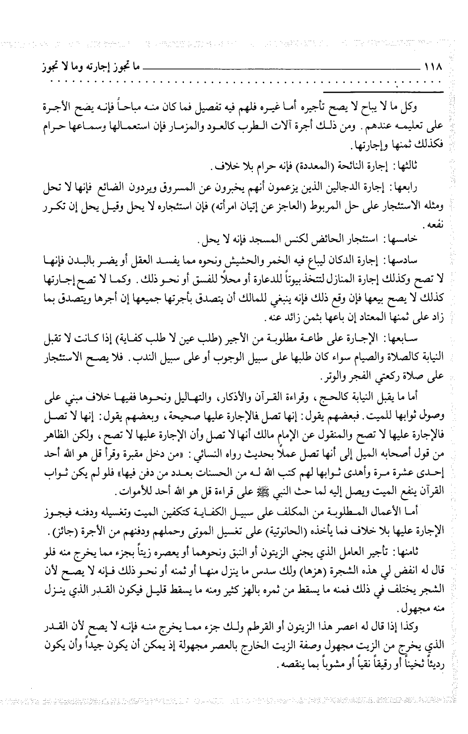 سادسها: إجارة الدكان ليباع فيه الخمر والحشيش ونحوه مما يفسد العقل أو يضر بالبدن فإنها لا تصح وكذلك إجارة المنازل لتتخذ بيوتاً للدعارة أو محلاً للفسق أو نحو ذلك. وكما لا تصح إجارتها كذلك لا يصح بيعها على ثمنها المعتاد إن باعها بثمن زائد عنه.