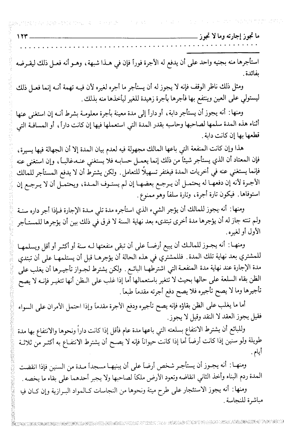 ومنها: أنه يجوز أن يستأجر شخص أرضاً على أن يبنيها مسجداً مدة السنين فإذا انقضت المدة ردم البناء وأخذ الثاني انقاضه وتعود الأرض ملكاً لصاحبها ولا يجبر أحدهما على بقاء ما يخصه. ومنها: أنه يجوز الاستئجار على طرح ميتة ونحوها من النجاسات كالمواد البرازية وإن كان فيه مباشرة للنجاسة.