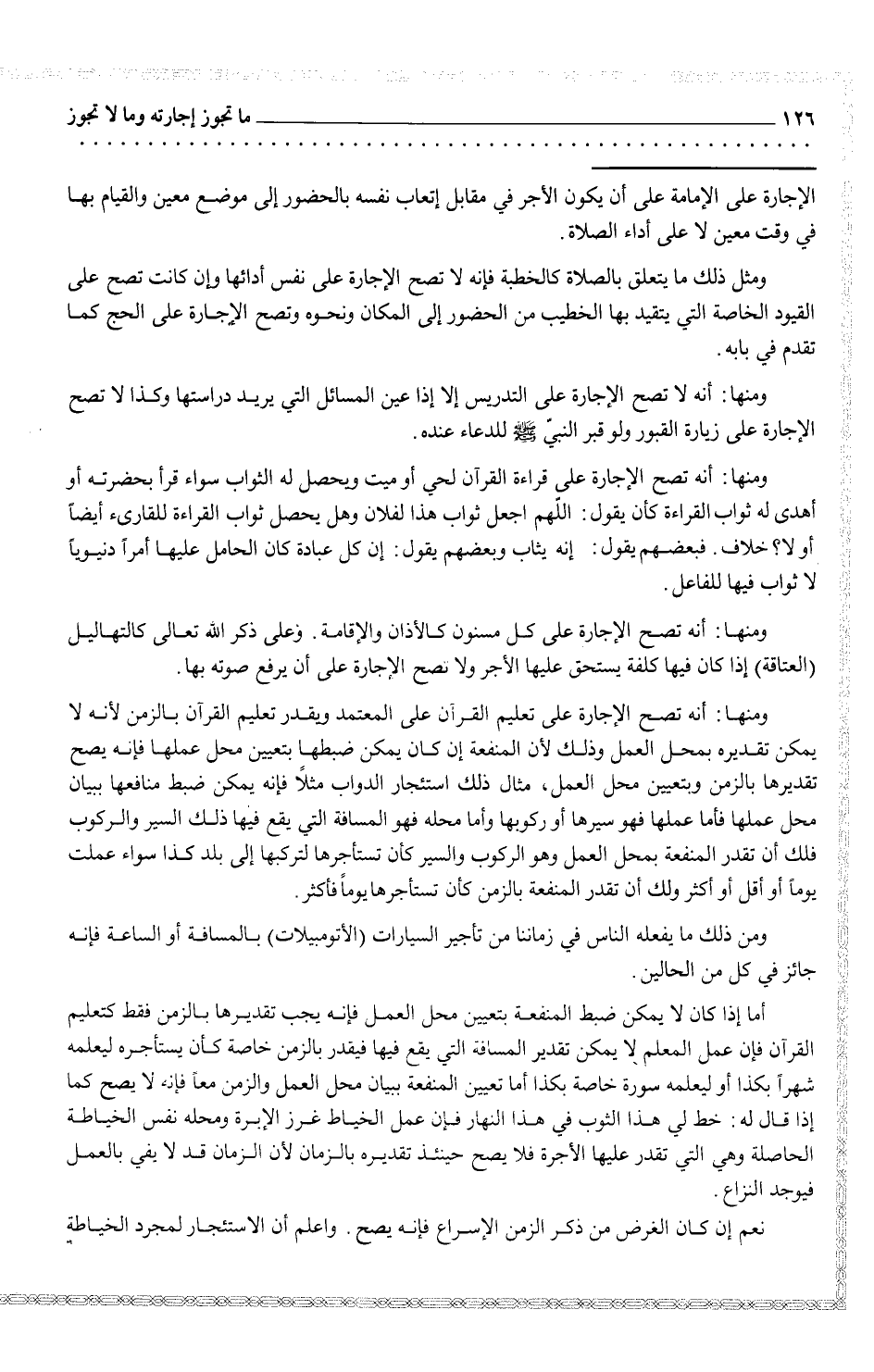 ومنها: أنه لا تصح الإجارة على التدريس إلا إذا عين المسائل التي يريد دراستها وكذا لا تصح الإجارة على زيارة القبور ولو قبر النبي صلى الله عليه وسلم للدعاء عنده.