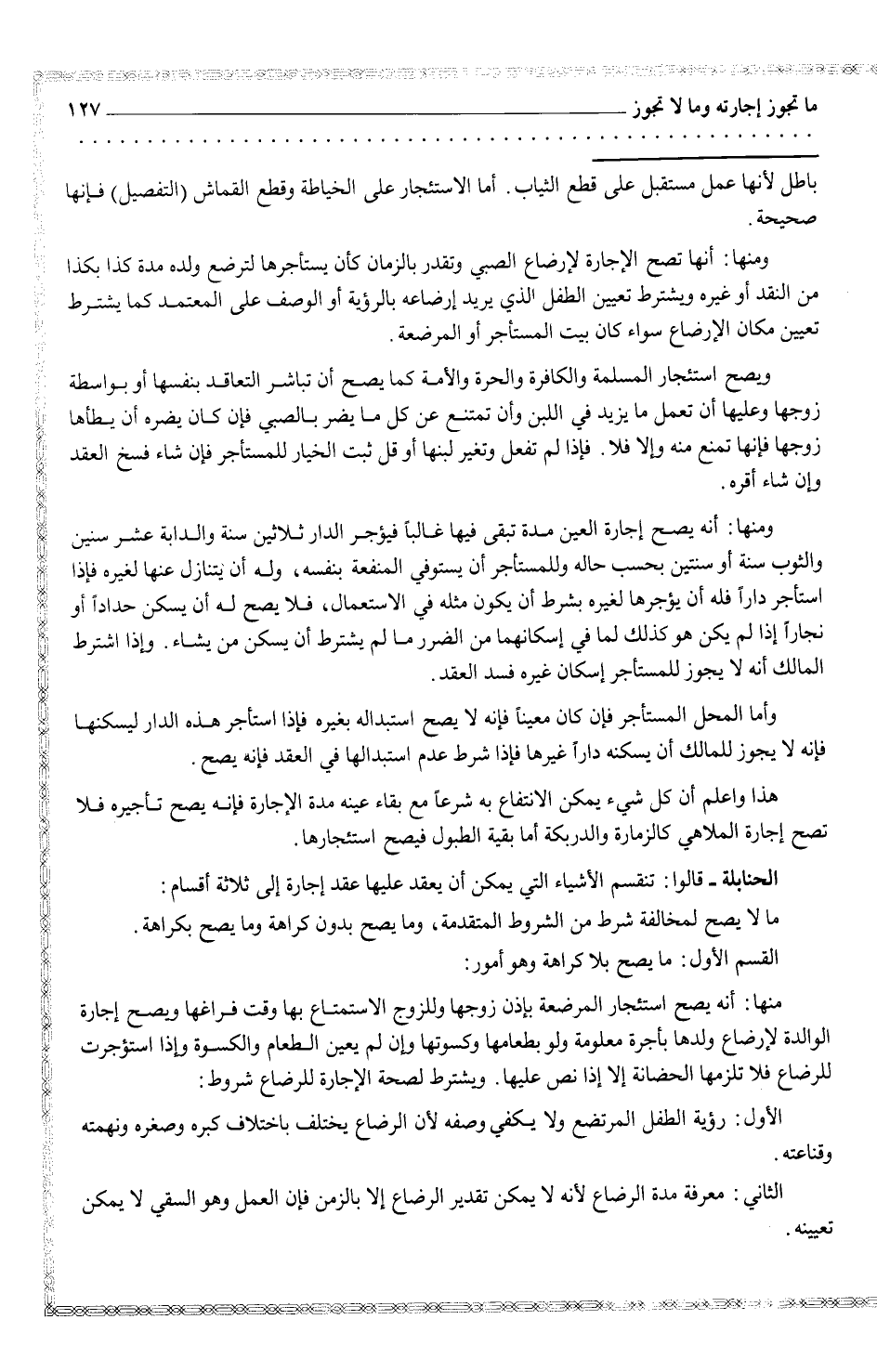 الحنابلة - قالوا: تنقسم الأشياء التي يمكن عليها عقد إجارة إلى ثلاثة أقسام: