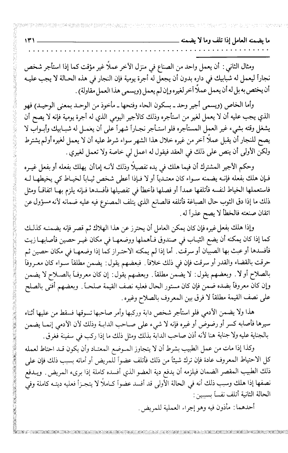 ومثال الثاني: أن يعمل واحد من الصناع في منزل الآخر عملاً غير مؤقت كما استأجر شخص نجاراً ليعمل له شبابيك في داره بدون أن يجعل له أجرة يومية فإن النجار في هذه الحالة لا يجب عليه أن يختص به بل له عملاً لغيره وإن لم يعمل (ويسمى هذا العمل مقاولة)