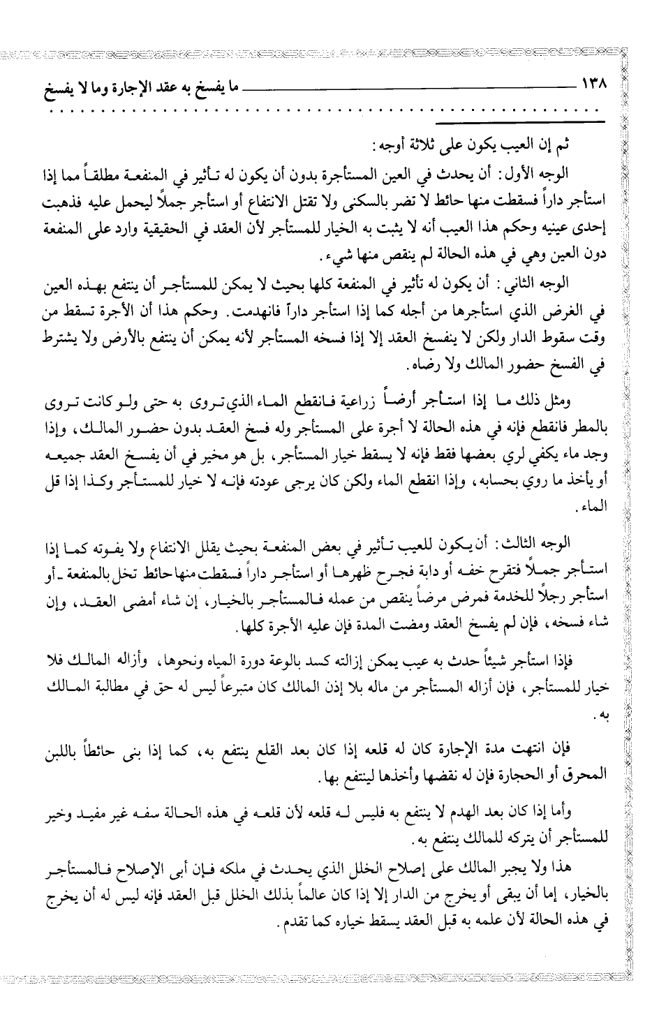 ومثل ذلك ما استأجر أرضاً زراعية فانقطع الماء الذي تروي به حتو لو كانت تروى بالمطر فانقطع فإنه في هذه الحالة لا أجرة على المستأجر وله فسخ العقد بدون حضور المالك، وإذا وجد ماء يكفي لري بعضها فقط فإنه لا يسقط خيار المستأجر، بل هو مخير في أن يفسخ العقد جميعه أو يأخذ ما روي بحسابه، وإذا انقطع الماء ولكن كان يرجى عودته فإنه لا خيار للمستأجر وكذا إذا قل الماء.