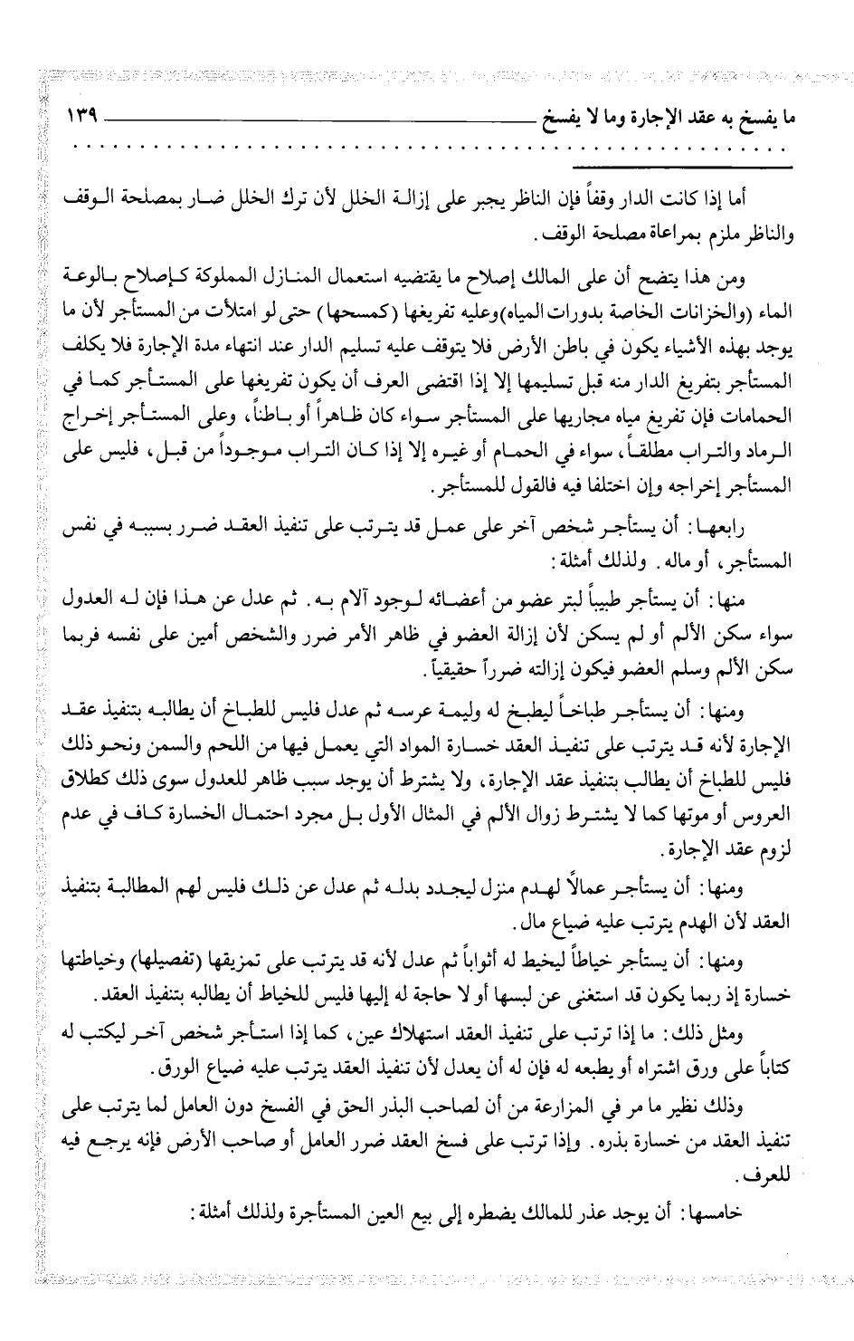 ومنها: أن يستأجر طباخاً ليطبخ له وليمة عرسه ثم عدل فليس للطباخ أن يطالبه بتنفيذ عقد الإجارة لأنه قد يترتب على تنفيذ العقد خسارة المواد التي يعمل فيها من اللحم والسمن ونحو ذلك فليس للطباخ أن يطالب بتنفيذ عقد الإجارة، ولا يشترط أن يوجد سبب ظاهر للعدول سوى ذلك كطلاق العروس أو موتها كما لا يشترط زوال الألم في مثال الأول بل مجرد احتمال الخسارة كاف في عدم لزوم عقد الإجارة.