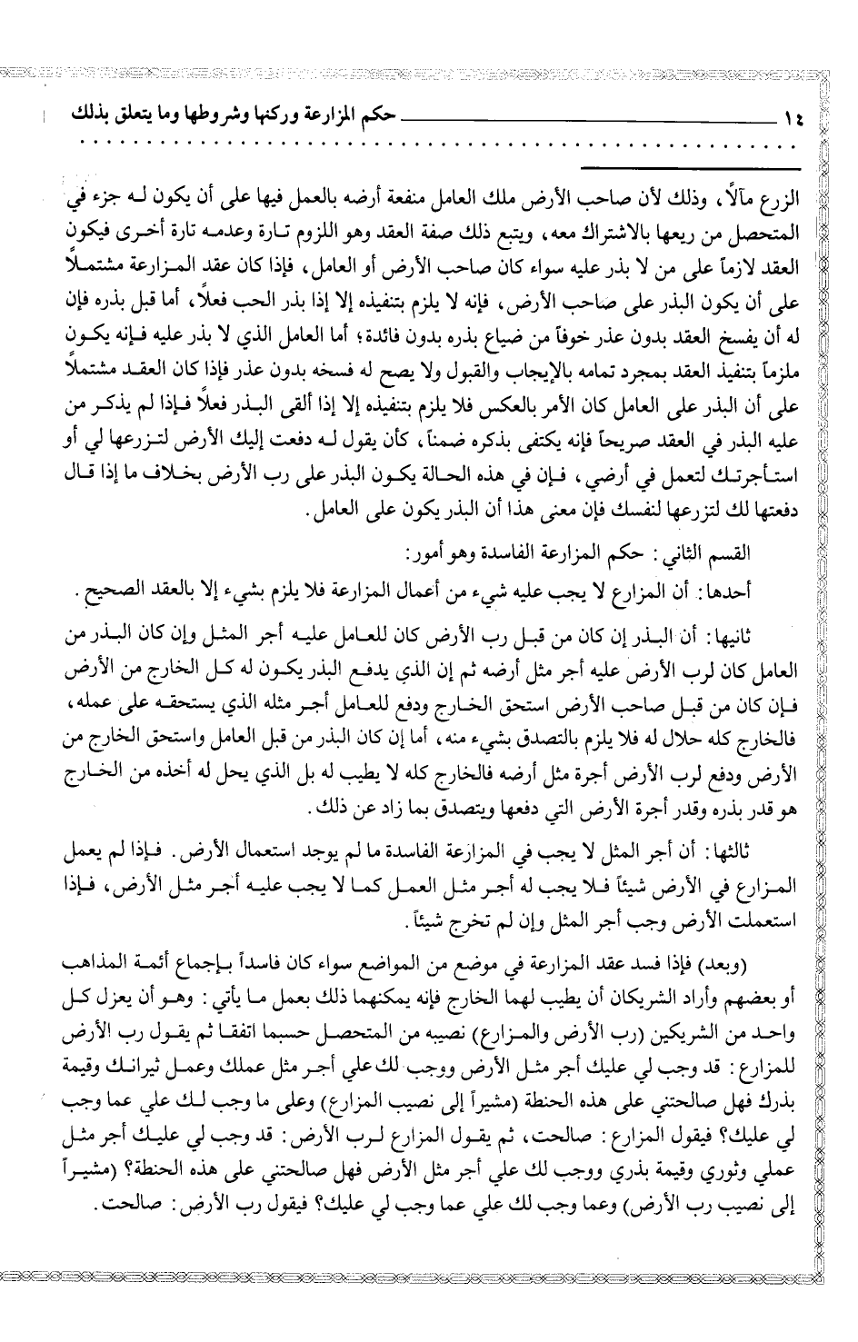 (وبعد) فإذا فسد عقد المزارعة في موضع من مواضع سواء كان فاسداً بإجماع أئمة المذاهبأو بعضهم وأراد الشريكين أن يطيب لهما الخارج فإنه يمكنهما ذلك بعمل ما يأتى: وهو أن يعزل كل واحد من الشريكين (رب الأرض والمزارع) نصيبه من المتحصل حسبما اتفقا ثم يقول رب الأرض للمزارع: قد وجب لي عليك أجر مثل الأرض ووجب لك علي أجر مثل عملك وعمل ثيرانك وقيمة بذرك فهل صالحتنى هذه الحنطة (مشيراً إلى نصيب المزارع) وعلى ما وجب لك علي مما وجب لى عليك؟ فيقول المزارع: صالحت، ثم يقول المزارع لرب الأرض: قد قد وجب لي عليك أجر مثل عملى وثورى وقيمة بذري ووجب لك علي مثل الأرض صالحتنى على هذه الحنطة؟ (مشيراً إلى نصيب رب الأرض) وعما وجب لك على عما وجب لى عليك؟ فيقول رب الأرض: صالحت.