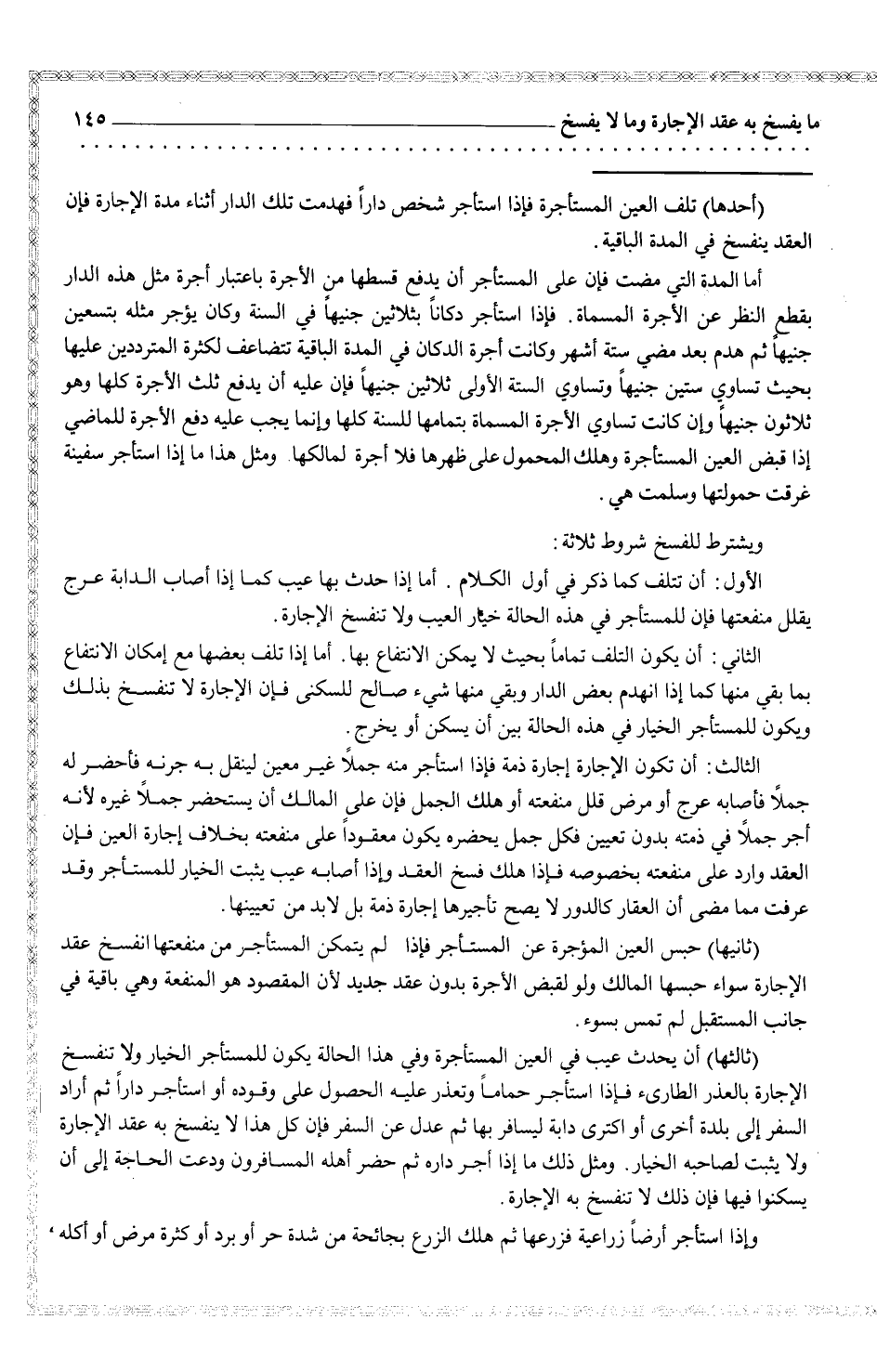 (ثالثها) أن يحدث عيب في العين المستأجرة وفي هذه الحالة يكون للمستأجر الخيار ولا تنفسخ الإجارة بالعذر الطارئ فإذا استأجر حماماً وتعذر عليه الحصول على وقوده أو استأجر داراً ثم أراد السفر لى بلدة أخرى أو اكترى دابة ليسافر ثم عدل عن السفر فإن كل هذا لا ينفسخ به عقد الإجارة ولا يثبت لصاحبه الخيار. ومثل ذلك ما إذا أجر داره ثم حضر أهله المسافرون ودعت الحاجة إلى أن يسكنوا فيها فإن ذلك ولا تنفسخ به الإجارة.
