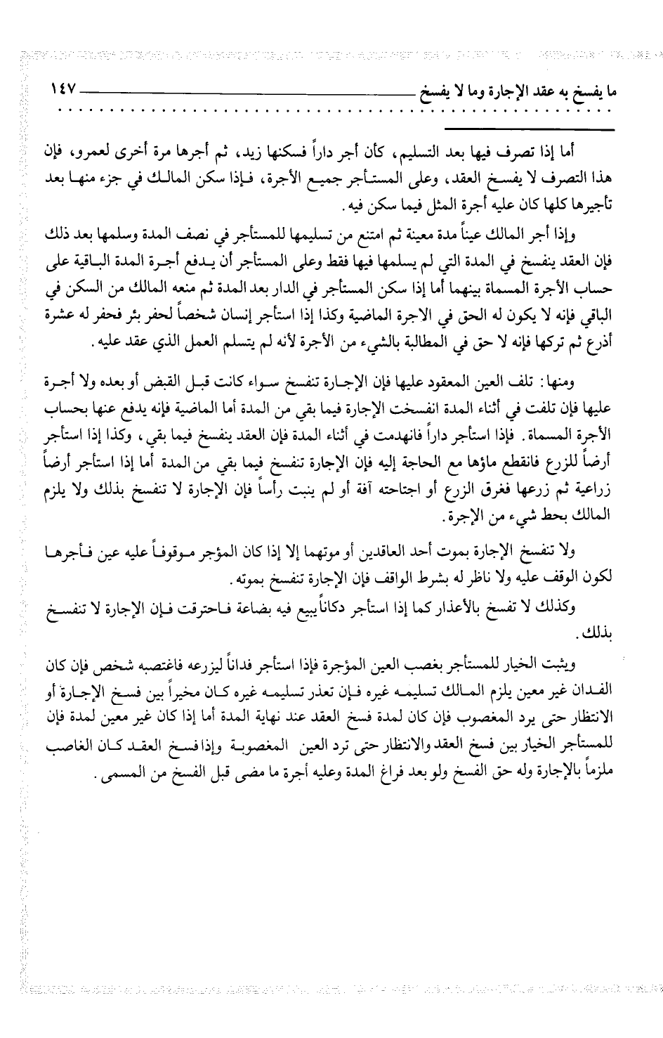 ولا تنفسخ الإجلرة بموت أحد العاقدين أو موتهما إلا إذا كان المؤجر موقوفاً عليه فأجرها لكون الوقف عليه ولا ناظر له بشرط الواقف فإن الإجارة تنفسخ بموته.
