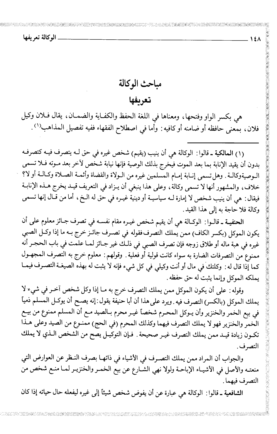 (¬1) (المالكية - قالوا: الوكالة هي أن ينبت (يقيم) سخص غيره في حق له يتصرف فيه كتصرفه بدون أن يقيد الإنانية بما بعد الموت فيخرج بذلك الوصية فإنها نيابة شخص لآخر بعد موته فلا تسمى الوصية وكالة. وهل تسمى إنابة إمام المسلمين غيره من الولاة والقضاء وأئمة الصلاة وكالة أو لا؟ خلاف، والمشهور أنها لا تسمى وكالة، وعلى هذا ينبغي أن يزاد في التعريف قيد يخرج هذه الإنانية فيقال: هي أن ينيب