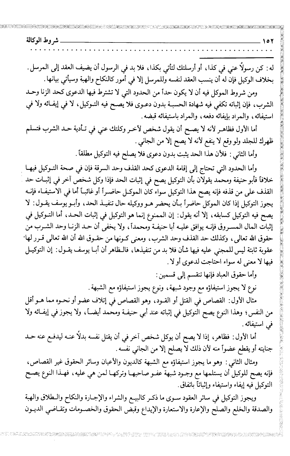 وأما الحدود التي تحتاج إلى إقامة الدعوى كحد القذف وحد السرقة في صحة التوكيل فيها خلافاً فأبو حنيفة ومحمد يقولان بأن التوكيل يصح في إثبات الحد فإذا وكب شخص آخر في حد القذف على من قذفه فإنه يصح هذا التوكيل سواء كان الموكل حاضراً أو غائباً أما في الاسيفاء فإنه يجوز التوكيل إذا كان الموكل حاضراً بأن يحضر هو ووكيله حال تنفيذ الحد، وأبو يوسف يقول: لا يصح فيه التوكيل كسابقه، إلا أنه يقول: إن الممنوع إنما هو التوكيل في إثبات الحد، أما التوكيل في إثبات المال المسروق فإنه يونفق عليه أبا حنيفة ومحمداً، ولا يخفى أن حد الزنا وحد الشرب من حقوق الله تعالى، وكذلك حد القذف وحد الشرب، ومعنى كونها من حقوق الله أن الله تعالى قرر لها عقوبة ثابتة ليس للمجني عليه فيها شأن فلا بد من تنفيذها، فالظاهر أن أبا يوسف يقول: إن التوكيل فيها لا معنى له سواء احتاجت لدعوى أو لا.