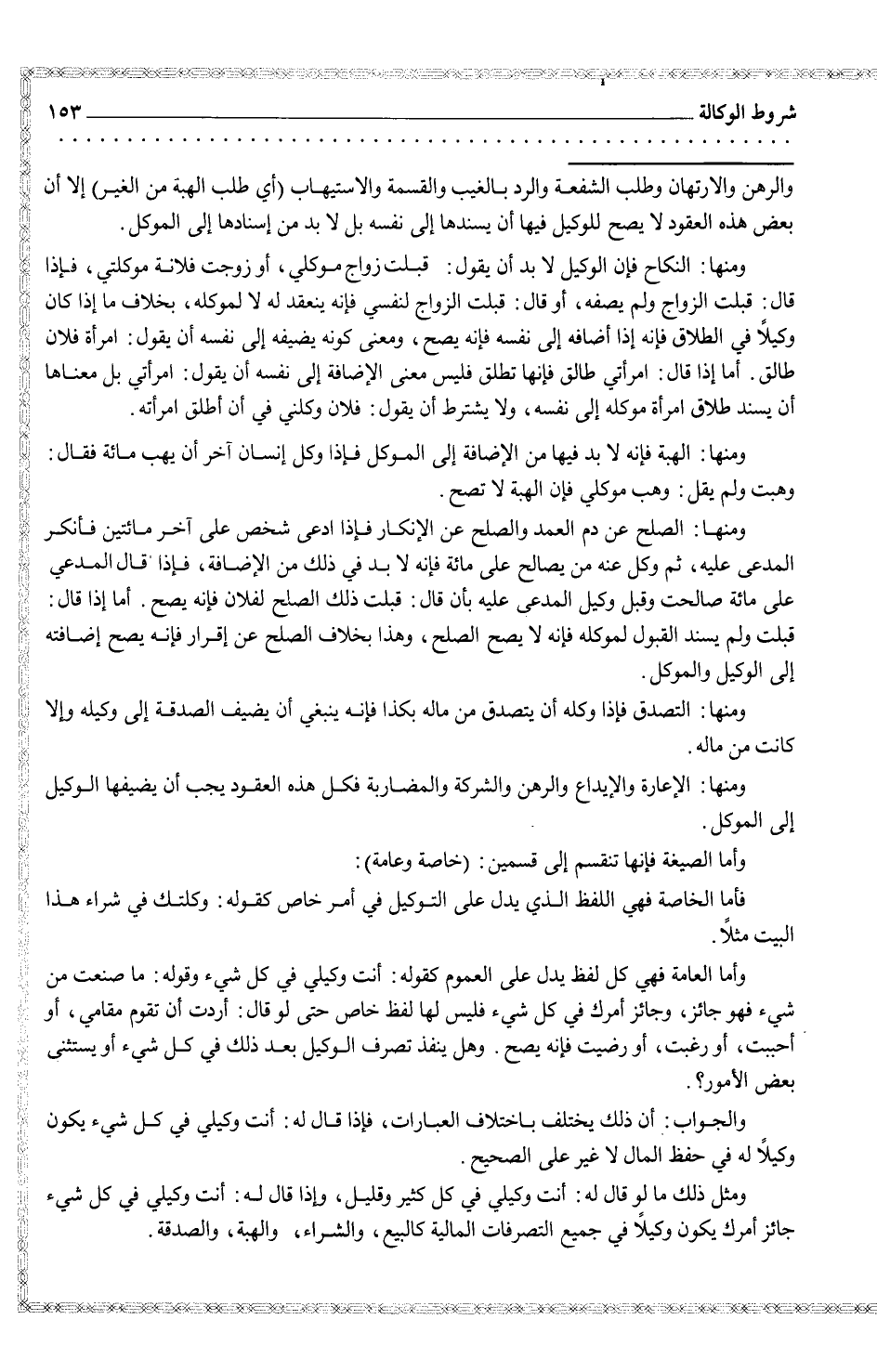 فأما الخاصة فهي اللفظ الذي يدل على التوكل في أمر خاص كقوله: وكلتك في شراء هذا البيت مثلاً. وأما العامة فهي لفظ يدل على العموم كقوله: أنت وكيلي في كل شيء وقوله: ما صنعت من شيء فهو جائز، وجائز أمرك في كل شيء فليس لها لفظ خاص حتى لو قال: أردت أن تقوم مقامي، أو أحببت، أو رغبت فإنه يصح. وهل ينفذ تصرف الوكيل بعد ذلك في كل شيء أو يستثنى بعض الأمور؟