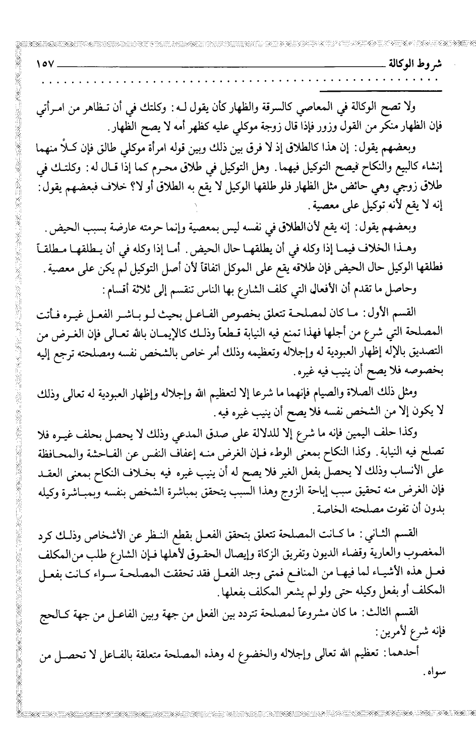 وبعضهم يقول: إنه يقع الطلاق في نفسه ليس بمعصبة وإنما حرمته عارضة بسبب الحيض وهذا الخلاف فيما إذا وكله في أن يطلقها حال الحيض. أما إذا وكله في أن يطلقها مطلقاً فطلقها الوكيل حال الحيض فغن طلاقه يقع على الموكل اتفاقاً لأن أصل التوكيل لم يكن على معصية. وحاصل ما تقدم أن الأفعال التي كلف الشارع بها الناس تنقسم إلى ثلاثة أقسام: