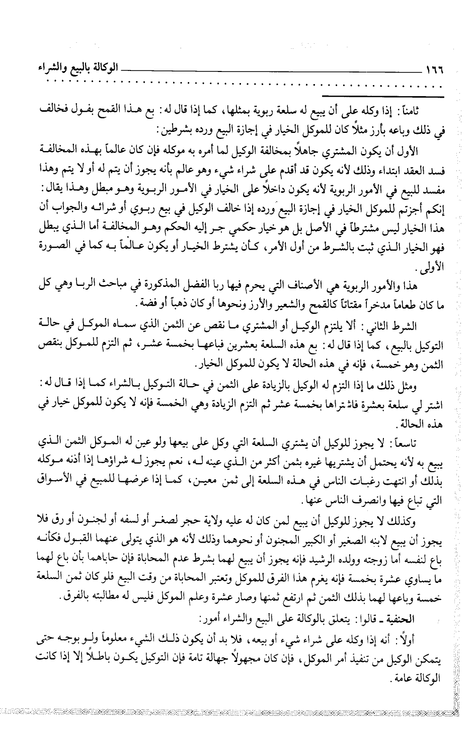 تاسعاً: لا يجوز للوكيل أن يشتري السلعة التي وكل على بيعها ولو عين له الموكل الثمن الذي يبيع به لأنه يحتمل أن يشتريها غيره بثمن أكثر من الذي عينه له، نعم يجوز له شراؤها إذا أذنه موكله بذلك أو انتهت رغبات الناس في هذه السلعة الى ثمن معين، كما إذا عرضها للمبيع في الأسواق التي تباع فيها وانصرف التاس عنها.