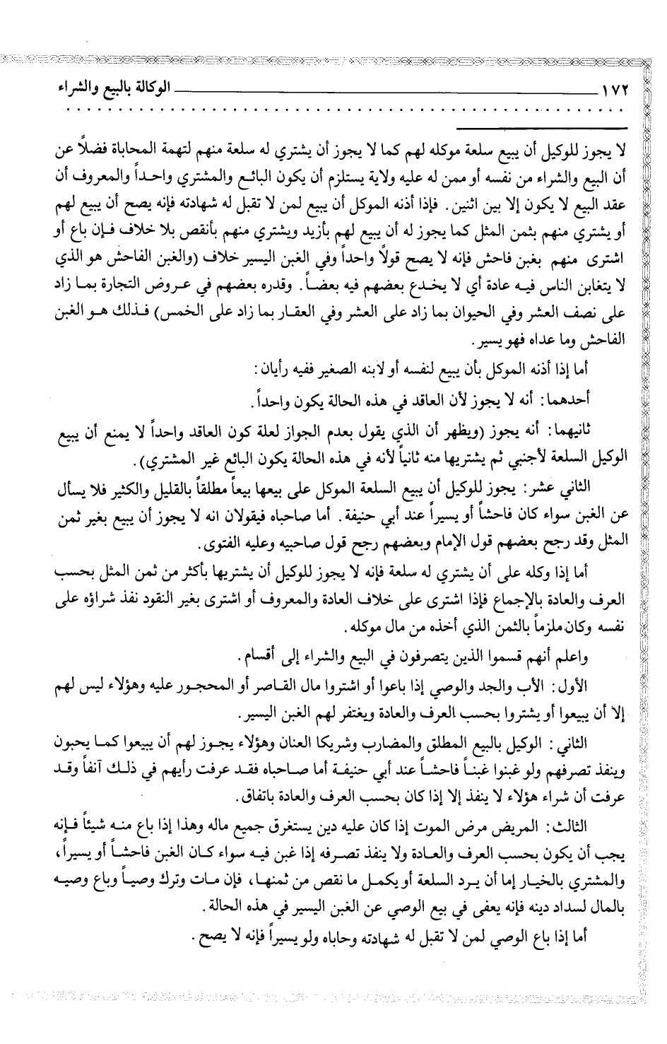 الثاني عشر: يجوز للوكيل أن يبيع السلعة الموكل على بيعها بيعاً مطلقاً والكثير فلا يسأل عن الغبن سواء كان فاحشاً أو يسيراُ عند أبي حنيفة. اما صاحباه فيقولان انه يجوز أن يبيع بغير ثمن. المثل وقد رجح بعضهم قول الإمام وبعضهم رجح قول صاحبيه وعليه الفتوى.