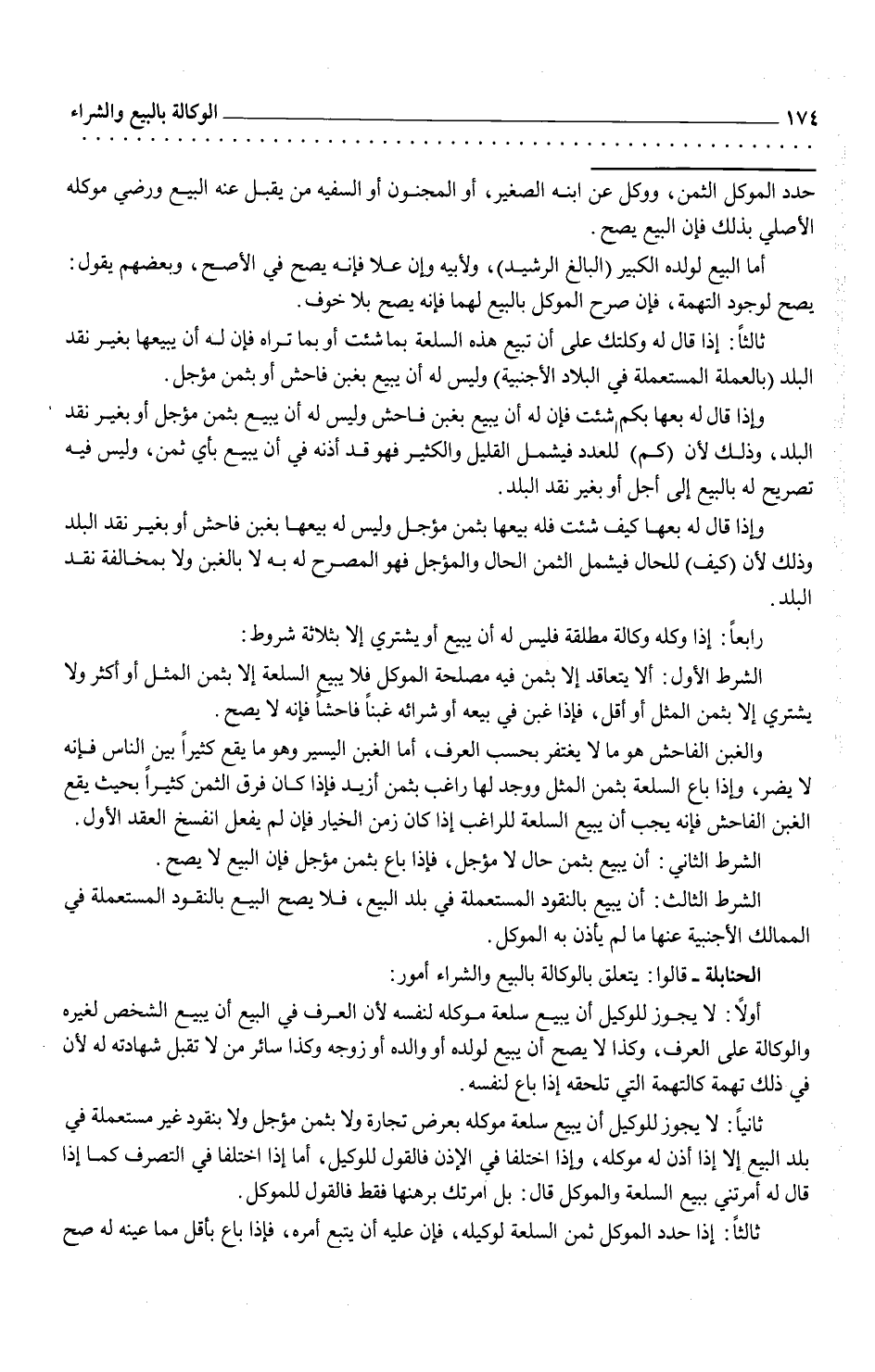 الحنابلة - قالوا: يتعلق بالوكالة بالبيع والشراء أمور: