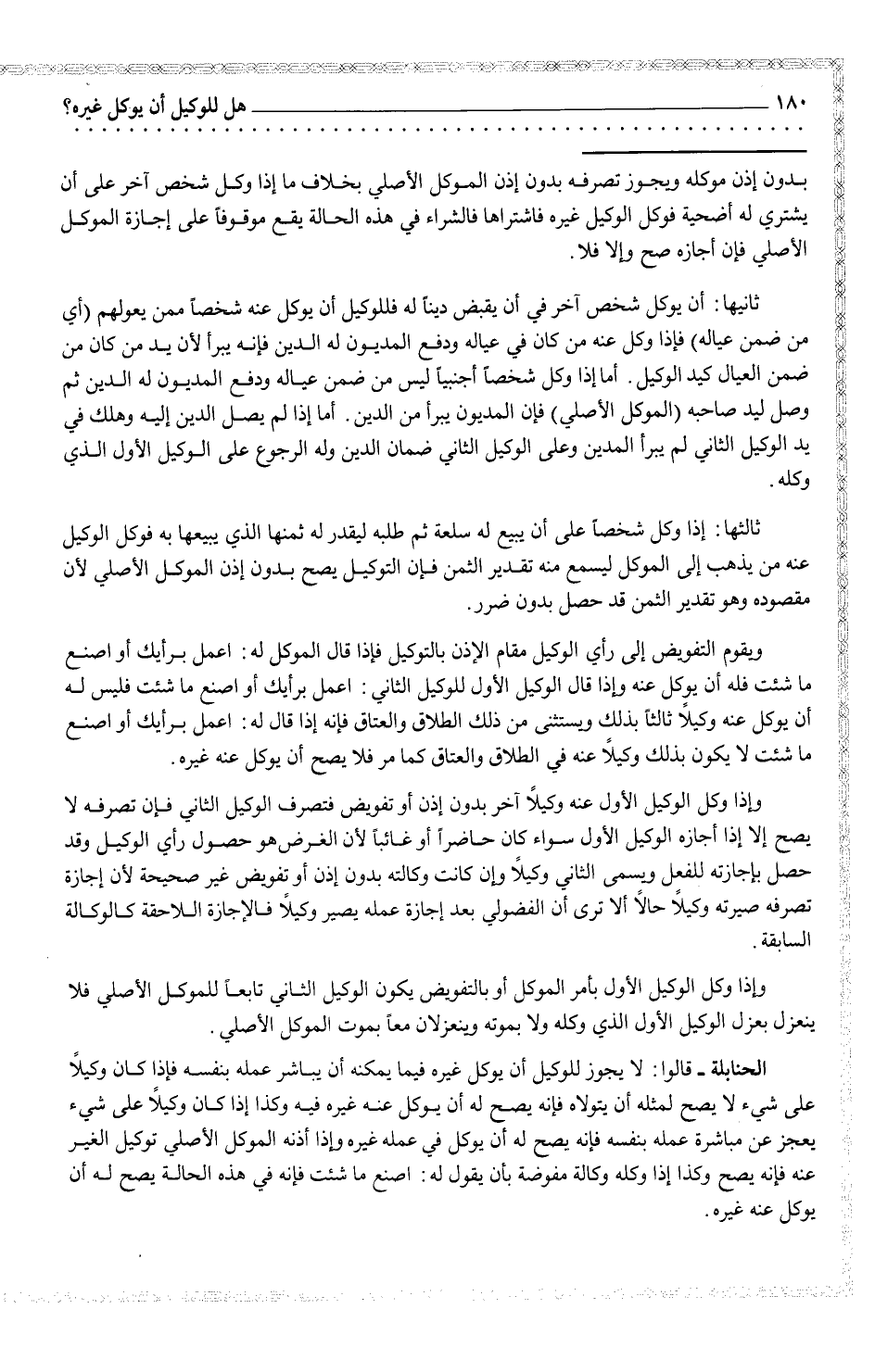 الحنابلة - قالوا: لا يجوز للموكل أن يوكل غيره فيما يمكنه أن يباشر عمله بنفسه فإذا كان وكيلاً على شيء لا يصح لمثله أن يتولاه فإنه يصح له أن يوكل غيره فيه وكذا كان وكيلاً على شيء يعجز عن مباشرة عمله بنفسه فإنه يصح له أن يوكل في عمله غيره وإذا أذنه الموكل الأصلي توكيل الغير عنه فإنه يصح وكذا إذا وكله ومالة مفوضة بان يقول له: اصنع ما شئت فإنه في هذه الحالة يصح له أن يوكل عنه غيره.