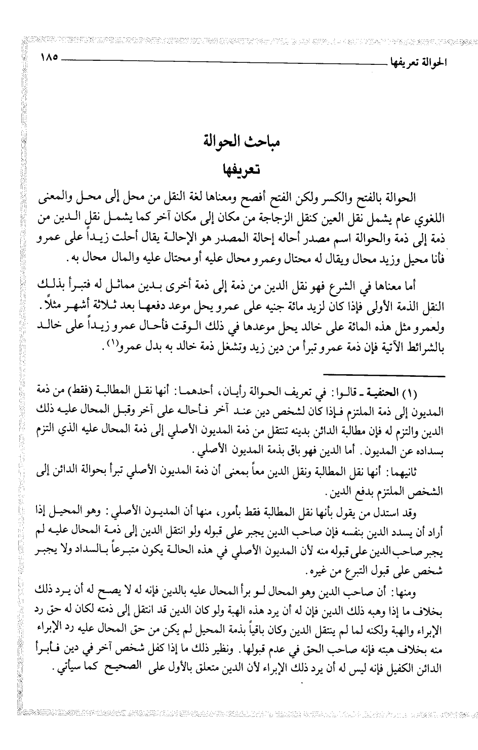 (¬1) (الحنفية - قالوا: في تعريف الحوالة رأيان: أحدهما: أنها نقل المطالبة (فقط) من ذمة المديون إلى ذمة الملتزم فإذا كان لشخص دين عند آخر فأحاله على آخر وقبل المحال عليه ذلك الدين والتزم له فإن مطالبتة الدائن بدينه تنتقل من ذمة المديون الأصلي إلى ذمة المحال عليه الذي التزم بسداده عن المديون. أما الدين فهو باق بذمتة المديون الأصلي.