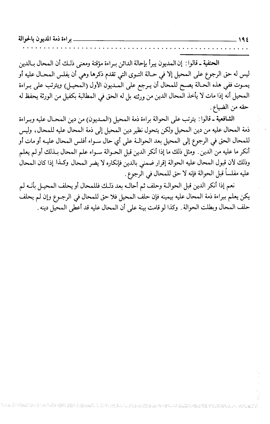 الحنفية - قالوا: إن المديون يبرأ بإحالة الدائن مؤقتة ومعنى ذلك أن المحال بالدين ليس له حق الرجوع على الحيل إلا في حالة التوى التي تقدم ذكرها وهي أن يفلس المحال عليه أو بموت ففي هذه الحالة يصح للمحال أن يرجع على المديون الأول (المحيل) ويترتب على براءة المحيل أنه إذا مات لا يأخذ المحال الدين من ورثته بل له الحق في المطالبة بكفيل من الورثة يحفظ له حقه من الضياع.