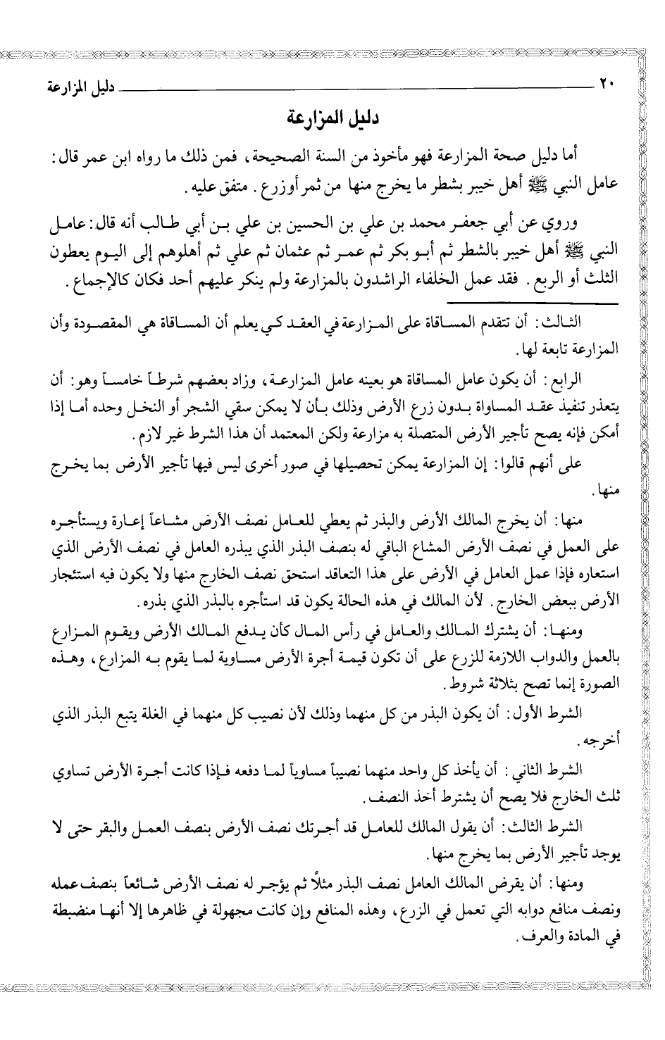 ومنها: أن يشترك المالك والعامل في رأس المال كأن يدفع المالك الأرض ويقوم المزارع بالعمل والدواب اللازمة على أن تكون قيمة اجرة الأرض مساوية لما يقوم به المزارع، وهذه الصورة إنما تصح بثلاثة شروط.