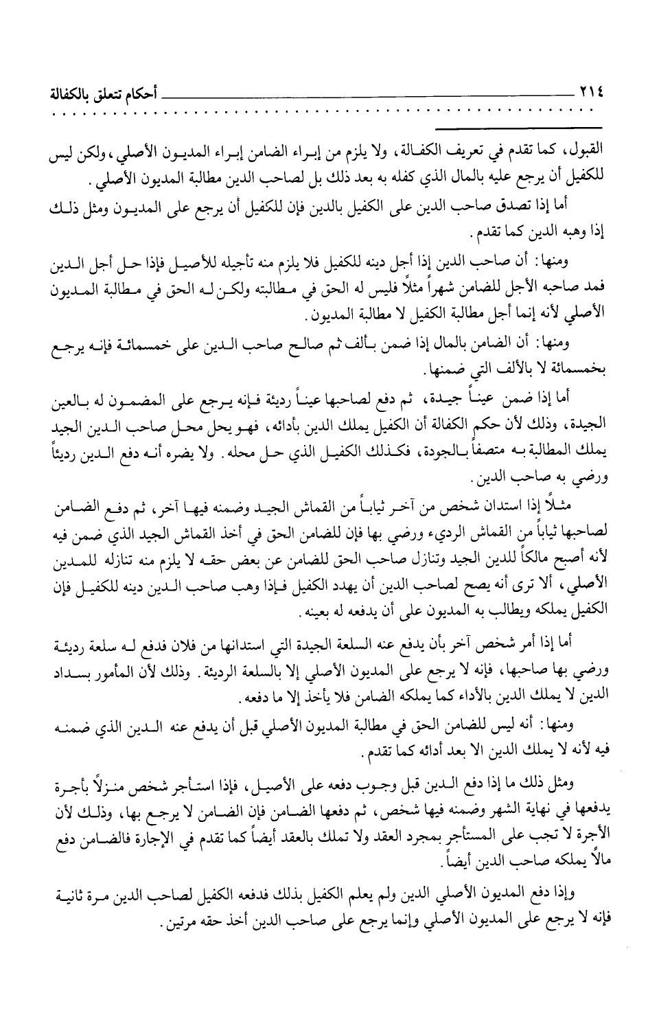 القبول، كما تقدم في تعريف الكفالة، ولا يلزم من إبراء الضامن المديون الأصلي، ولمن ليس للكفيل أن يرجع عليه بالمال الذي كفله به بعد ذلك لصاحب الدين مطالبة المديون الأصلي.
