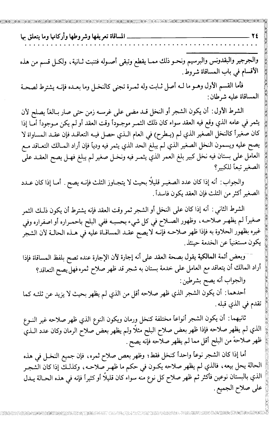 والجرجير والبقدونس والبرسيم ونحو ذلك مما يقطع وتبقى أصوله فتنبت ثانية، ولكل قسم من هذه المساقاة عليه شرطان.