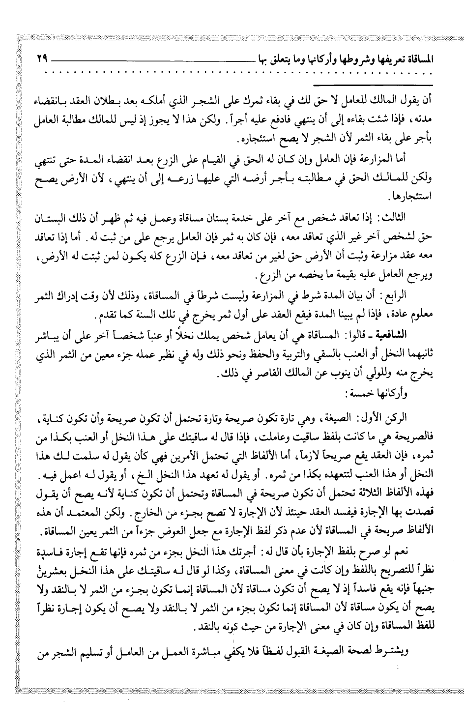 الركن الأول: الصيغة، وهي تارة تكون صريحة وتارة تحتمل أن تكون صريحة وأن تكون كناية، فالصريحة هي ما كانت بلفظ ساقيت وعاملت، فإذا قال له ساقيتك على هذا النخل أو العنب بكذا من ثمره، فإن العقد يقع صريحاً لازماً، اما الألفاظ التي تحتمل الأمرين فهي كأن يقول له سلمت لك هذا النخل أو هذا العنب لتتعهده بكذا من ثمره. أو يقول له تعهد هذا النخل الخ، أو يقول له اعمل فيه. فهذه الألفاظ الثلاثة تحتمل أن تكون صريحة في المساقاة وتحتمل أن تكون كناية لأنه يصح أن يقول قصدت بها الإجارة فيفسد العقد حينئذ لأن الإجارة لا تصح بجزء من الخارج.