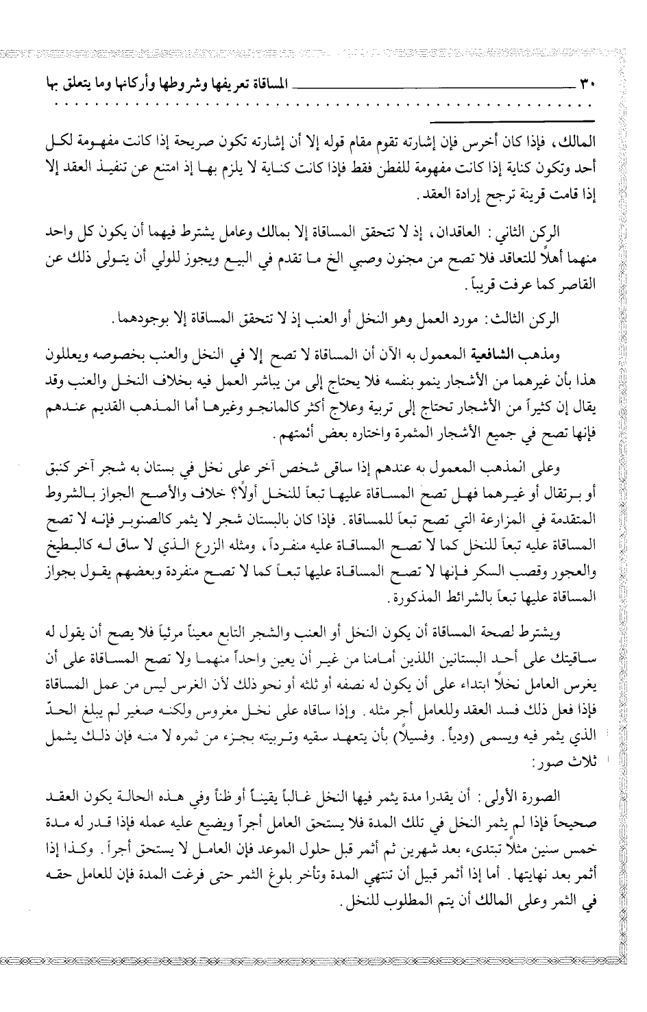 ويشترط لصحة المساقاة أن يكون النخل أو العنب والشجر التابع معيناً مرئياً فلا تصح أن يقول له ساقيتك على احد البستانين اللذين أمامنا من غير أن يعين واحداً منهما ولا تصح المساقاة على ان يغرس العامل نخلاً ابتداء على أن يكون له نصفه أو ثلثه أو نحو ذلك لأن الغرس ليس من عمل المساقاة فإذا فعل ذلك فسد العقد وللعامل أجر مثله. إذا ساقاه على نخل مغروس ولكنه صغير لم يبلغ الحد الذي يثمر فيه ويسمى (ودياً. وفسيلاً) بأن يتعهد سقيه وتربيته من ثمره لا منه فإن ذلك يشمل ثلاث صور: