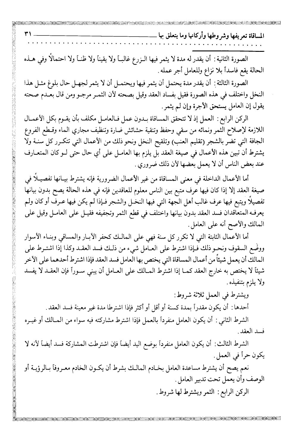 الركن الرابع: العمل إذ لا تتحق المساقاة بدون عمل فالعامل مكلف بأن يقوم بكل الأعمال اللازمة لإصلاح الثمر ونمائه من سقي وحفظه وتنقية حشائش ضارة وتنظيف مجاري الماء وقطع الفروع الجافة التي تضر بالشجر (تقليم العنب) وتلقيح النخل ونحو ذلك من الأعمال التي تتكرر كل سنة ولا يشترط ان تبين هذه الأعمال في صيغة العقد بل يلزم بها العامل على أي حال حتى حال لو كلن المتعارف عند بعض الناس أن لا يعمل بعضها لأن ذلك ضروري.