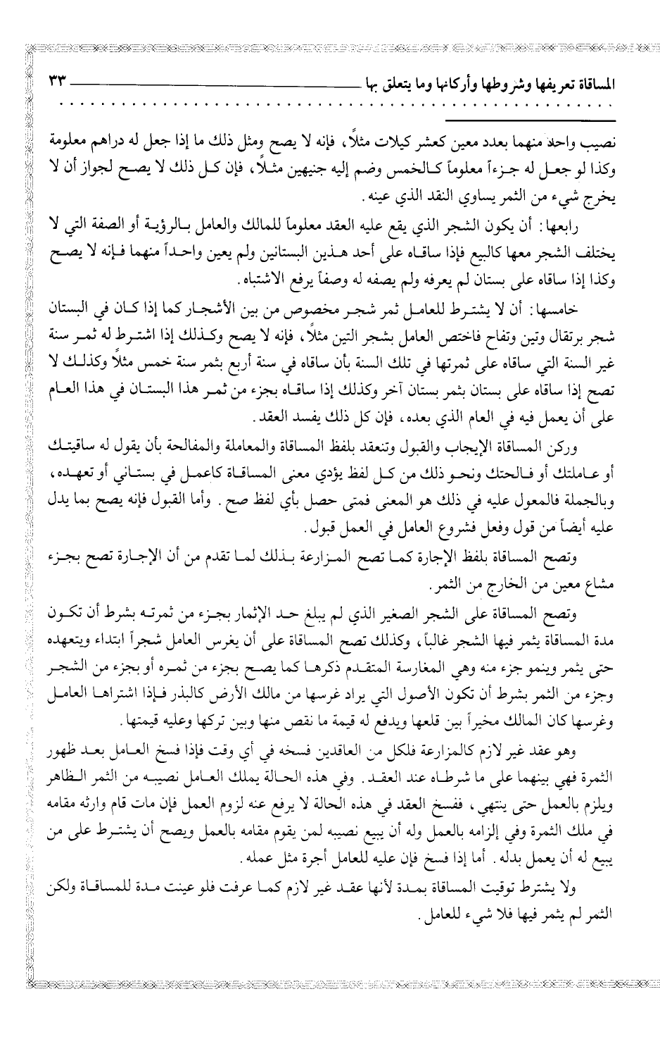 خامسهما: أن لا يشترط للعامل ثمر مخصوص من بين الأشجار كما إذا كان في البستان شجر برتقال وتين وتفاح فاختص العامل بشجر التين مثلاً، فإنه لا يصح وكذلك إذا اشترط له ثمر سنة غير السنة التي ساقاه في سنة أربع بثمر سنة خمس مثلاً وكذلك لا تصح إذا ساقاه على بستان بثمر بستان آخر وكذلك إذا ساقاه بجزء من ثمر هذا البستان في هذا العام على أن يعمل فيه في العام الذي بعده، فإن كل ذلك يفسد العقد.