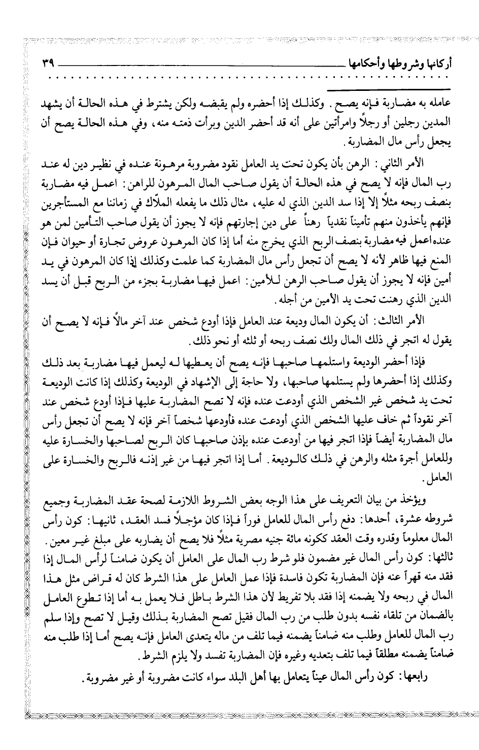 الأمر الثاني: الرهن بأن يكون تحت يد العامل نقود مضروبة مرهونة عنده في نظير دين له عند رب المال فإنه لا يصح في هذه الحلة أن يقول صاحب المال المرهون للراهن: اعمل فيه مضاربة بنصف ربحه مثلاَ إلا إذا سد الدين الذي له عليه، مثال ذالك ما يفعله الملاّك في زماننا مع المستأجرين فإنهم يأخذون منهم تأميناَ نقدياَ رهناَ على دين إجارتهم فإنه لا يجوز أن يقول صاحب التأمين لمن هو عنده اعمل فيه مضاربة بنصف الربح الذي يخرج منه أما إذا كان المرهون عروض تجارة أو حيوان فأن المنع فيها ظاهر لأنه لا يصح أن تجعل رأس مال المضاربة كما علمت وكذالك إذا كان المرهون في يد أمين فإنه لا يجوز أن يقول صاحب الرهن للأمين: اعمل فيها مضاربة بجزء من الربح قبل أن يسد الدين الذي رهنت تحت يد الأمين من أجله.